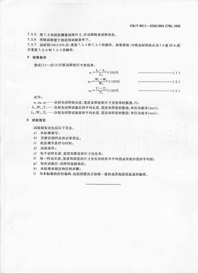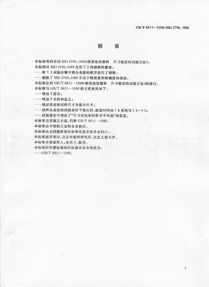 硬质泡沫塑料尺寸稳定性试验方法Rigidcellularplasties-Testmethodfordimensionalstability(ISO2796_1986IDT)348072@abc3天前发布关注私信0.62MB5页030硬质泡沫塑料尺寸稳定性试验方法Rigidcellularplasties-Testmethodfordimensionalstability(ISO2796_1986IDT)此内容为付费资源,请付费后查看¥23¥36黄金会员免费钻石会员免费立即购买您当前未登录!建议登陆后购买,可保存购买订单付费资源 第1页 / 共5页 第2页 / 共5页 第3页 / 共5页 第4页 / 共5页 第5页 / 共5页 已完成全部阅读,共5页 THE END标准规范 文本预览 ICs83.100G31中华人民共和国国家标准GB/T8811-2008/IS02796:1986代巷GB/T8811-1988硬质泡沫塑料尺寸稳定性试验方法Rigid cellular plastics-Test method for dimensional stability(1SO2796:1986,IDT)2008-01-04发布2008-09-01实施中华人民共和国国家质量监督检验检疫总局中国国家标谁化管理委员会发布 查看更多 收起部分 喜欢就支持一下吧收藏