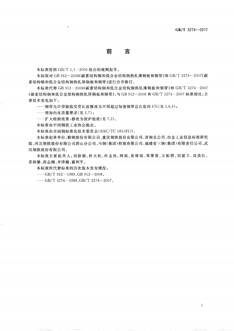 ICS70.140.50H46GB中华人民共和国国家标准GB/T3274-2017代替GB912-2008,GB/T3274-2007碳素结构钢和低合金结构钢热轧钢板和钢带Hot-rolled plates,sheets and strips of carbon structural steels andhigh strength low alloy structural steels2017-02-28发布2017-11-01实施中华人民共和国国家质量监督检验检疫总局中国国家标准化管理委员会发布、除品看直线