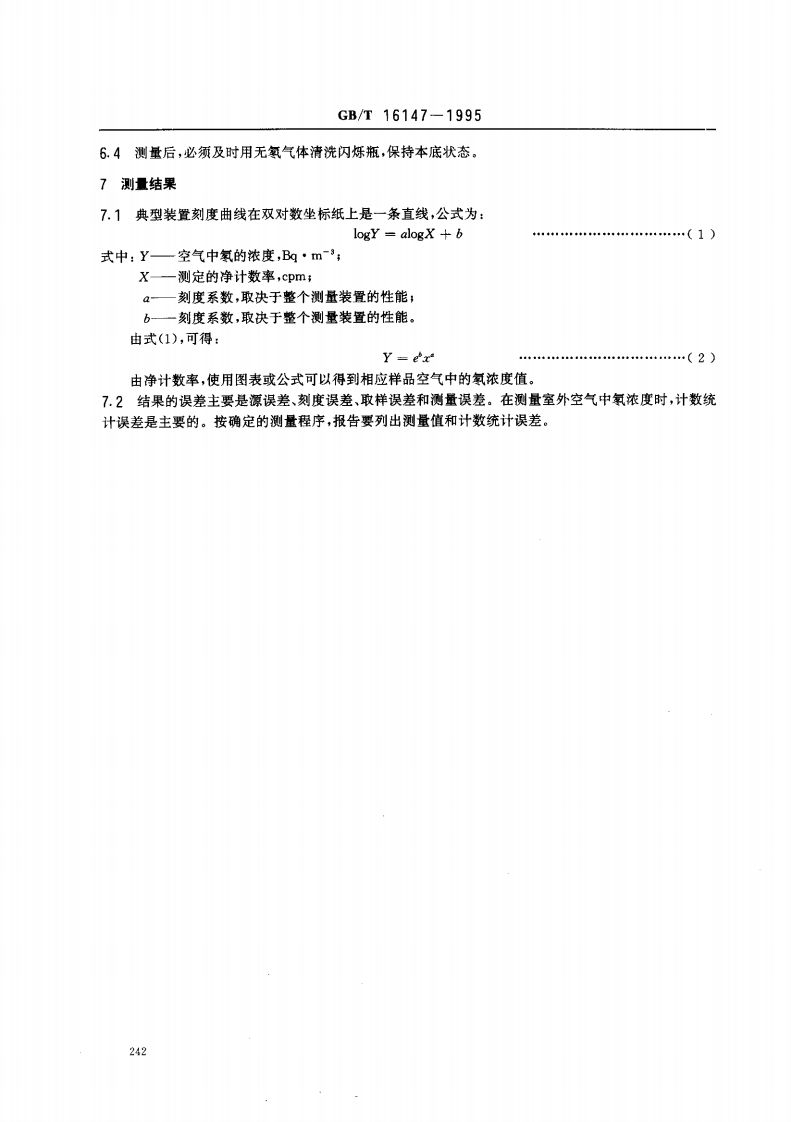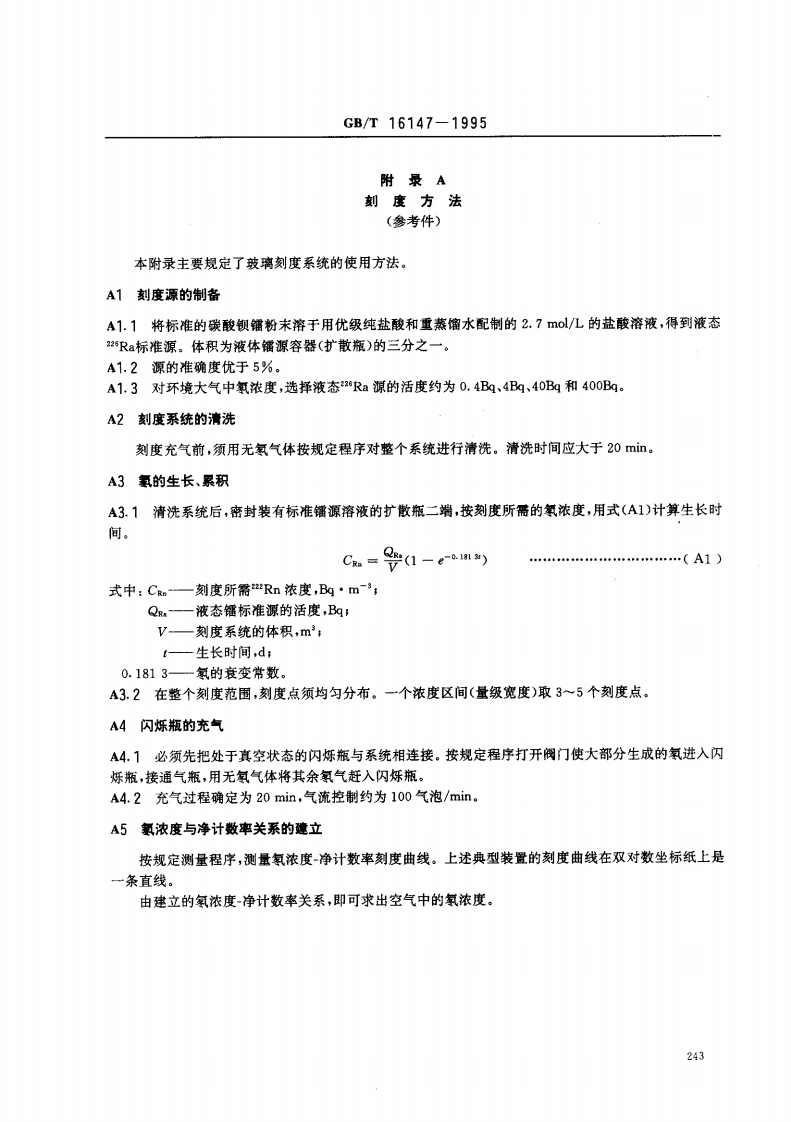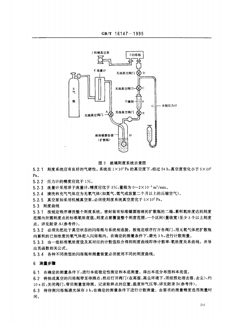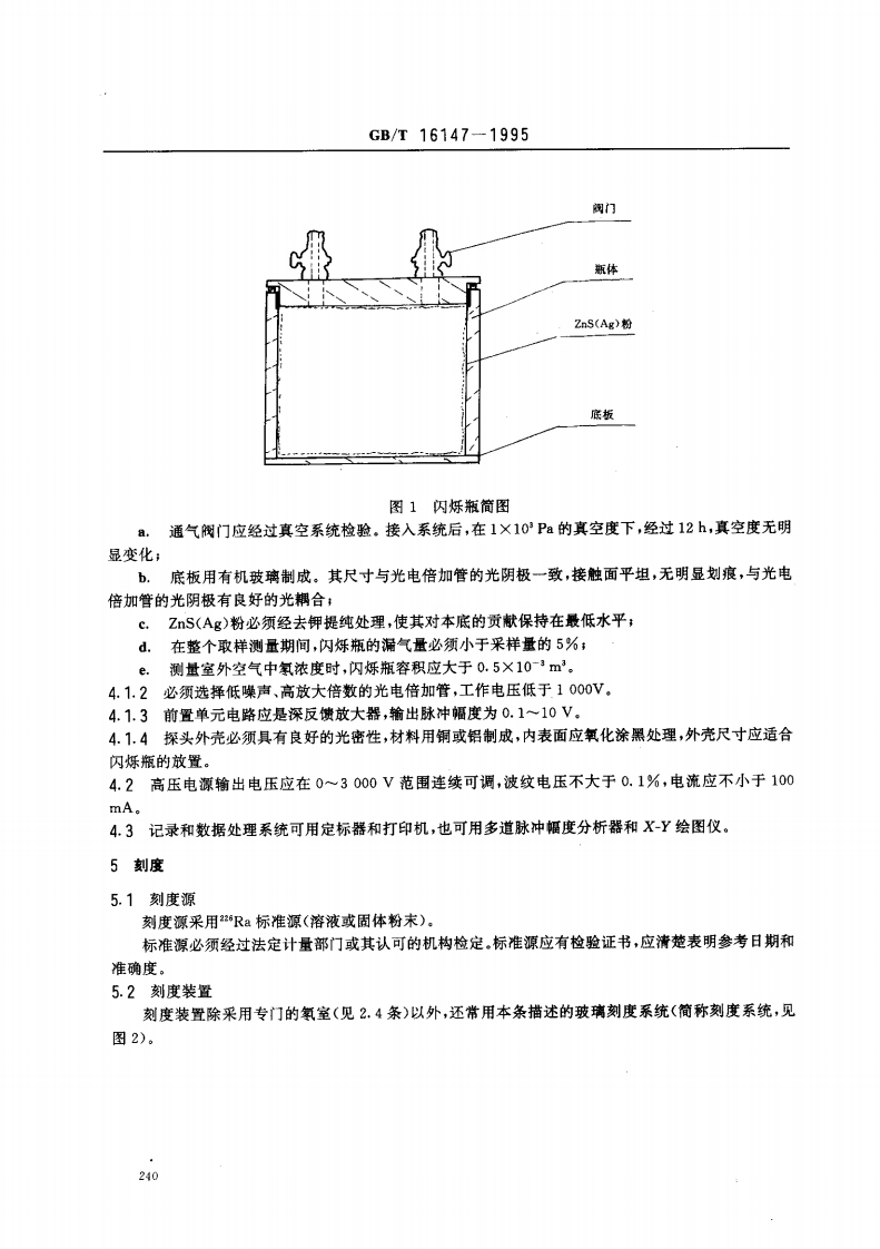 中华人民共和国国家标准GB/T16147-1995空气中氨浓度的闪烁瓶测量方法Scintillation flask method for measuringradon concentration in the air1主题内容与适用范围本标准规定了空气中氢(2R)浓度的闪烁瓶测量方法。本标准适用于室内外及地下场所等空气中氧浓度的测量。2术语2.1放射性气溶胶radioactive aerosol含有放射性核素的固态或液态徽粒在空气或其他气体中形成的分散系。2.2闪烁瓶scintillation flask一种氧探测器和采样容器。由不锈钢、铜或有机玻璃等低本底材料制成。外形为圆柱形或钟形,内层涂以ZS(Ag)粉,上部有密封的通气阀门。2.3瞬时采样grab sampling在几秒到几十分钟短时间内,采集空气样品的技术。2.4氡室radon chamber一种用于刻度氧及其短寿命子体探测器的大型标准装置。由氧发生器、温湿度控制仪和氧及其子体监测仪等设备组成。3方法概要按规定的程序将待测点的空气吸入已抽成真空态的闪烁瓶内。闪烁瓶密封避光3,待氢及其短寿命子体平衡后测量22Rn、1Po和1Po衰变时放射出的a粒子。它们入射到闪烁瓶的ZnS(Ag)涂层,使ZS(Ag)发光,经光电倍加管收集并转变成电脉冲,通过脉冲放大、甄别,被定标计数线路记录。在确定时间内脉冲数与所收集空气中氢的浓度是函数相关的,根据刻度源测得的净计数率-氧浓度刻度曲线,可由所测脉冲记数率,得到待测空气中氧浓度。4测量装置典型的测量装置由探头、高压电源和电子学分析记录单元组成。4.1探头由闪烁瓶、光电倍加管和前置单元电路组成。4.1.1典型的闪烁瓶(2.2条)简图见图1:国家技术监督局1995-12-15批准1996-07-01实施239