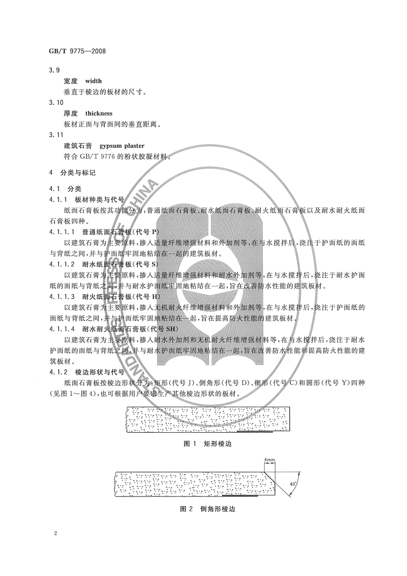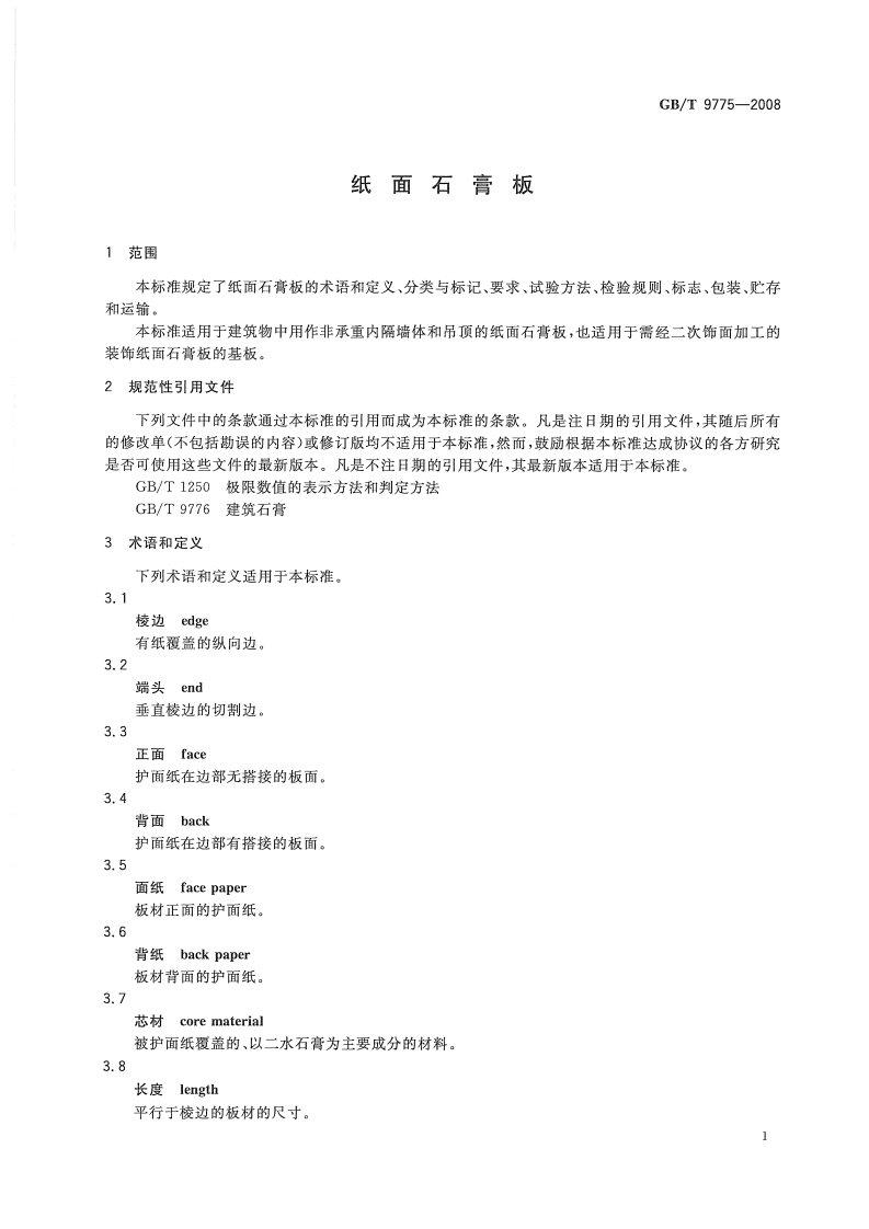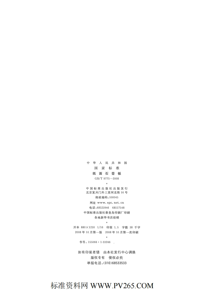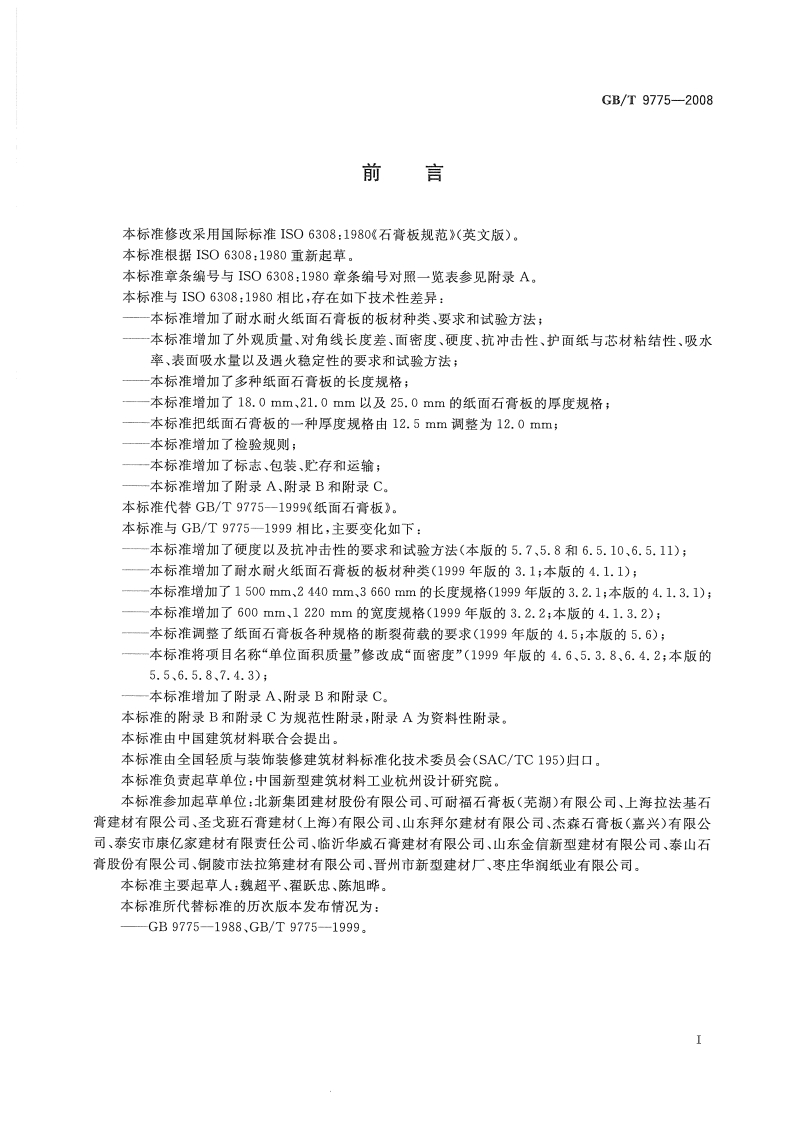 1CS91.100.10Q62中华人民共和国国家标准GB/T9775-2008代替GB/T9775-1999纸面石膏板Gypsum plasterboard(ISO6308:1980,MOD)2008-06-30发布2009-04-01实施中华人民共和国国家质量监督检验检疫总局中国国家标准化管理委员会发布标准资料网WWW.PV265.COM