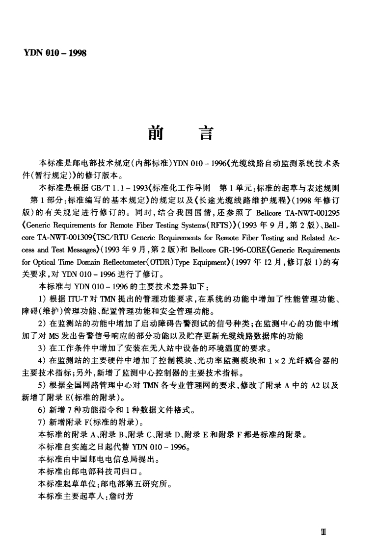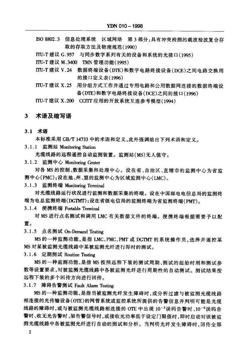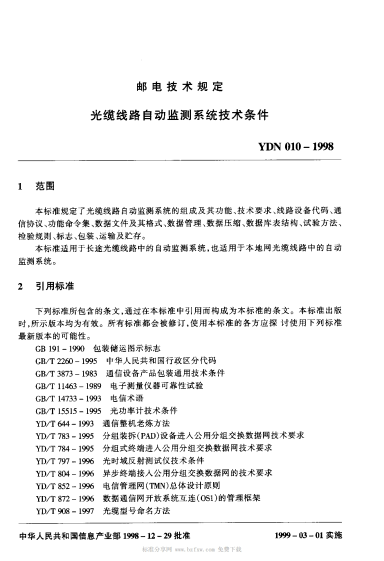 线路自动监测系统技术条件_光缆线路自动监测系统技术条件348072@abc3天前发布关注私信1.42MB54页046线路自动监测系统技术条件_光缆线路自动监测系统技术条件此内容为付费资源,请付费后查看¥23¥36黄金会员免费钻石会员免费立即购买您当前未登录!建议登陆后购买,可保存购买订单付费资源 第1页 / 共54页 第2页 / 共54页 第3页 / 共54页 第4页 / 共54页 第5页 / 共54页 试读已结束,还剩49页,您可下载完整版后进行离线阅读 THE END标准规范 文本预览 邮电技术规定YDN010-1998光缆线路自动监测系统技术条件1998-12-29.发布1999-03-01实施中华人民共和国信息产业部发布 查看更多 收起部分 喜欢就支持一下吧收藏