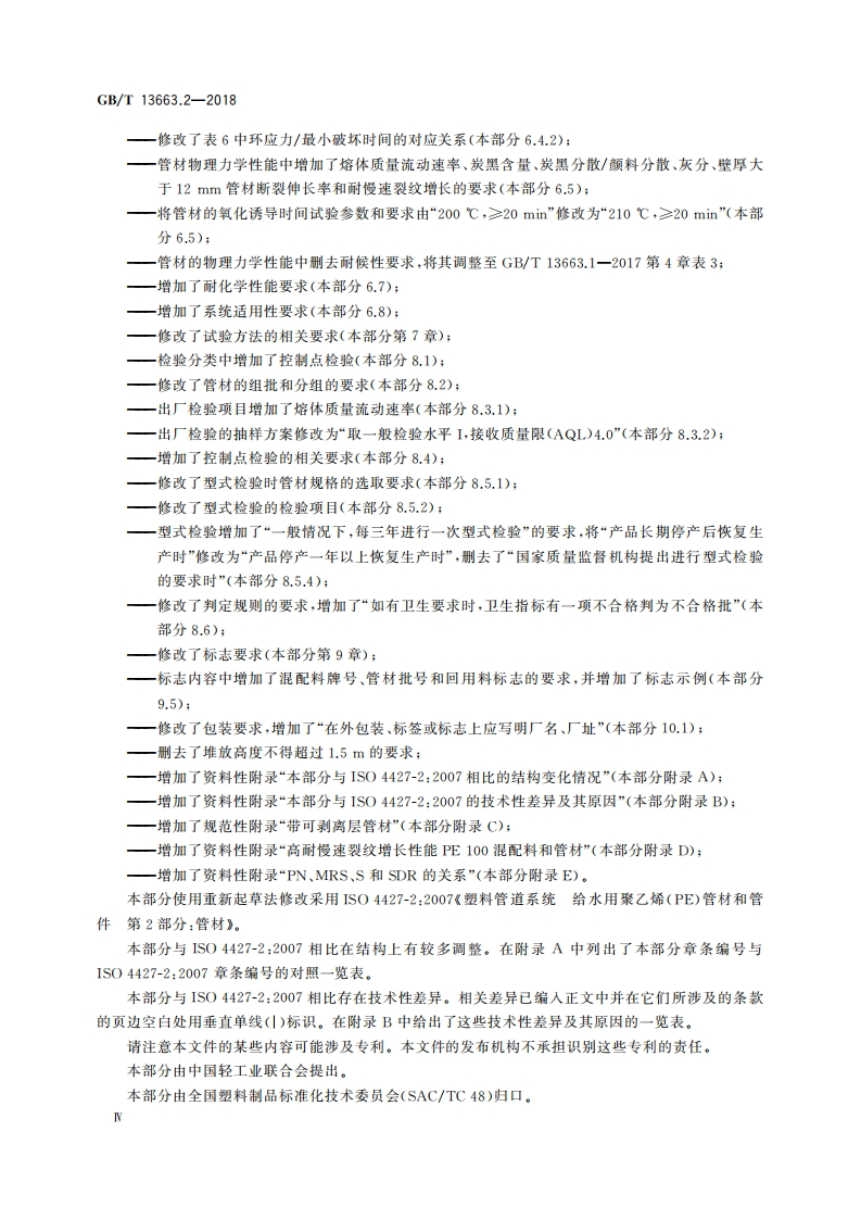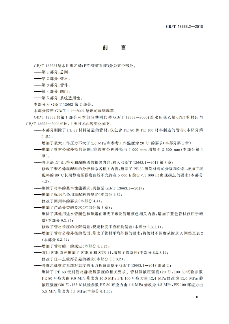1CS83.140.30G33中华人民共和国国家标准GB/T13663.2—2018部分代替GB/T13663一2000给水用聚乙烯(PE)管道系统第2部分:管材Polyethylene(PE)piping systems for water supply-Part 2:Pipes(ISO 4427-2:2007,Plastics piping systems-Polyethylene(PE)pipes andfittings for water supply-Part 2:Pipes,MOD)2018-03-15发布2018-10-01实施中华人民共和国国家质量监督检验检疫总局发布中国国家标准化管理委员会