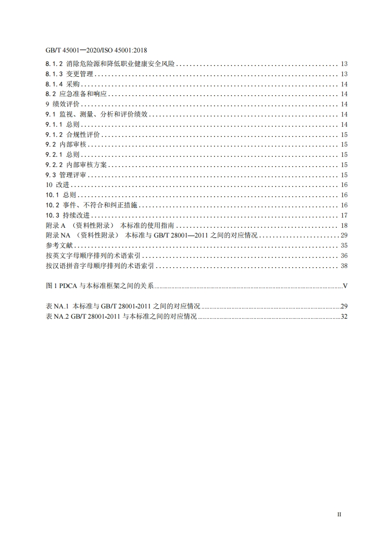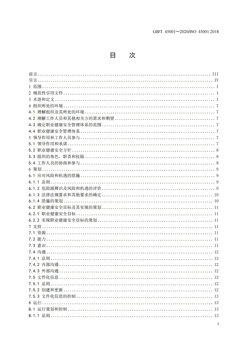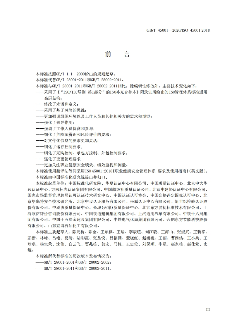 1CS13.100C78GB中华人民共和国国家标准GB/T45001-2020/1S045001:2018代替GB/T28001-2011和GB/T28002-2011职业健康安全管理体系要求及使用指南Occupat ional health and safety management systems-Requirements with guidance for use(1S045001:2018,1DT)2020-03-06发布2020-03-06实施中华人民共和国国家市场监督管理总局中国国家标准化管理委员会发布