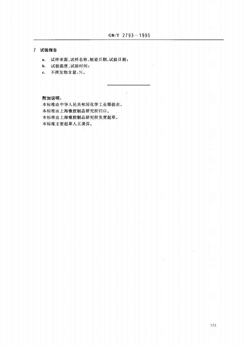 中华人民共和国国家标准GB/T2793-1995胶粘剂不挥发物含量的测定代替GB2793…81Test method for nonvolatile content of adhesives1主题内容与适用范围本标准规定了测定胶粘剂不挥发物含量的设备、试验温度、试验步骤和试验结果等。本标准适用于加热挥发时有明显质量损失的胶粘剂。2原理测定胶粘剂的不挥发物含量是使试样在一定温度下加热一定时间后,以加热后试样质量与加热前试样质量的百分比值表示。3仪器设备3.1鼓风恒温烘箱:温度波动不大于士2℃。3.2温度计:0~150℃,分度值为1℃。3.3称量容器:直径50mm,边高30mm的称量瓶或铝箔皿。3.4分析天平:感量为1mg。35干燥器:装有变色硅胶的干燥器。4试验温度、试验时间和取样量4.1氨基系树脂胶粘剂:试验温度105士2℃,试验时间180士5min,取样量1.5g。4.2酚醛树脂胶粘剂:试验温度135土2℃,试验时间60士2mi,取样量1.5g。4.3其他胶粘剂:试验温度105士2℃,试验时间180士5min,取样量1.0g。5试验步骤按要求称取胶粘剂试样,精确到0.001g,置于已在试验温度恒重并称量过的容器中,放入已按试验温度调好的鼓风恒温烘箱内加热,加热时间按第4章规定。取出试样,放入干燥器中冷却至室温,称其质量。6结果表示不挥发物含量按下式计算:X=%×100m式中:X一一不挥发物含量,%;m:一一加热后试样的质量,g:m一一加热前试样的质量,g。试验结果取两次平行试验的平均值,试验结果保留三位有效数字。国家技术监督局1995-12-20批准1996-08-01实施572