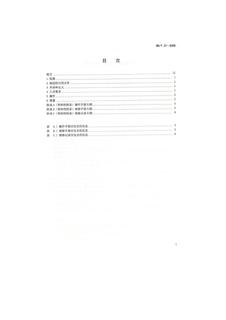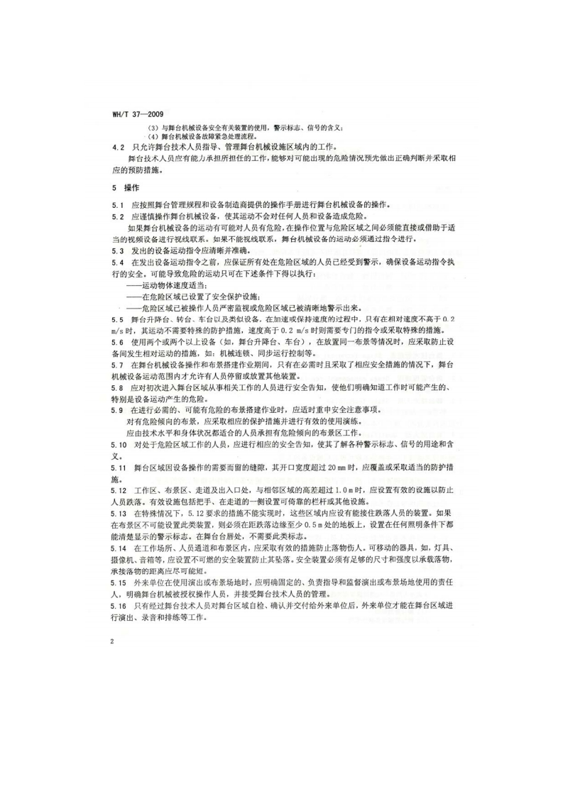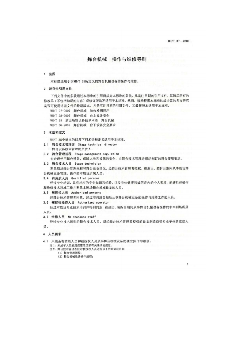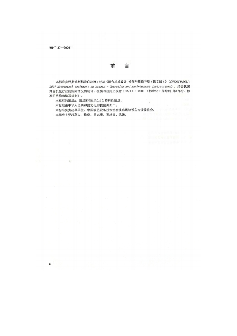 备案号:25956-2009WH中华人民共和国文化行业标准WH/T37一2009舞台机械操作与维修导则Mechanical equipment on stages-Operating and maintenance instructions(ONORM M 9631:2007 Mechanical equipment on stages -Operating andmaintenance instructions,NEQ)2009-03-06发布2009-06-01实施中华人民共和国文化部发布