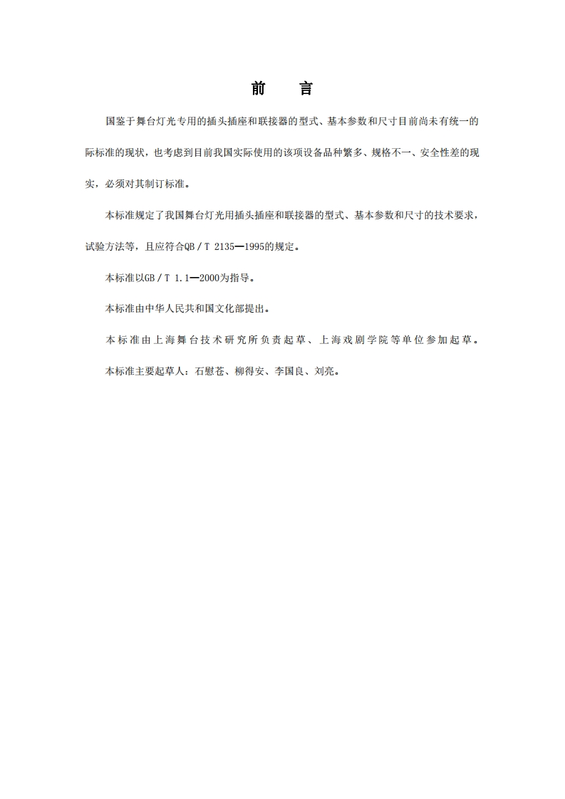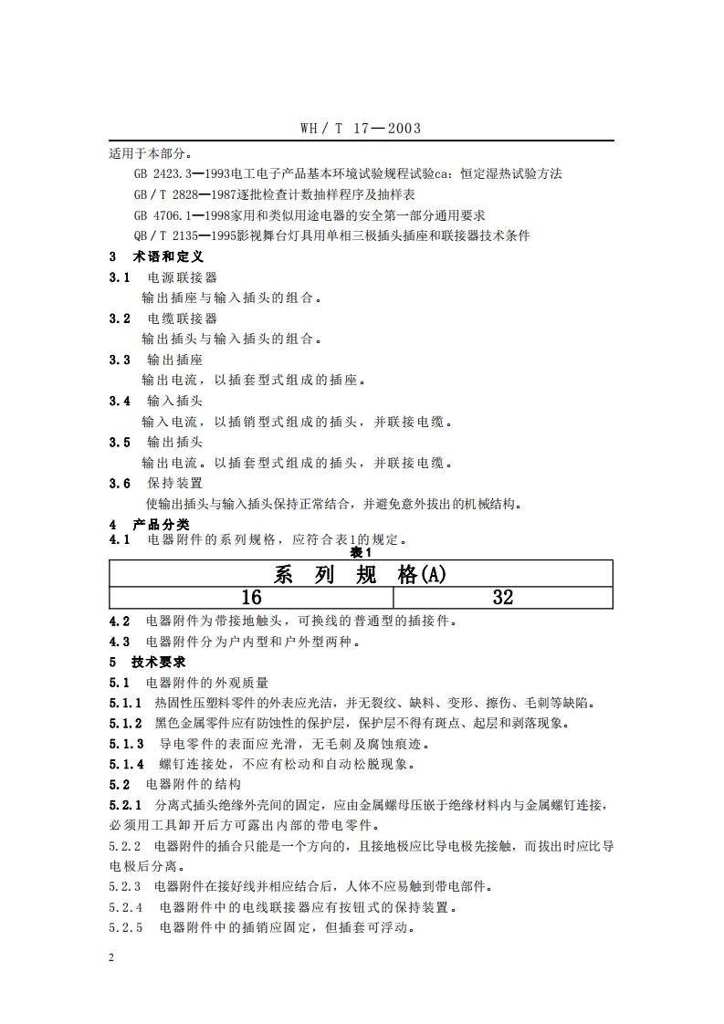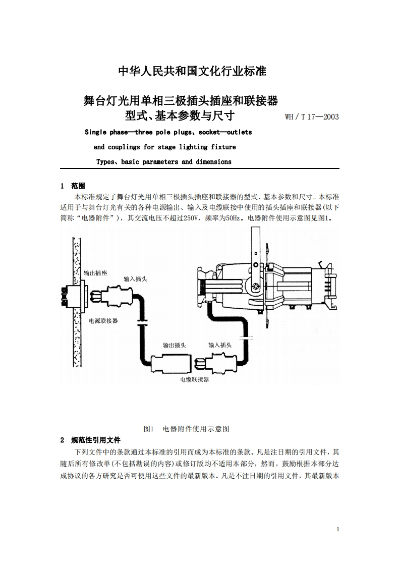 备案号:11429-2003WH中华人民共和国文化行业标准WH/T17一2003舞台灯光用单相三极插头插座和联接器型式、基本参数与尺寸Single phase-three pole plugs,socket-outletsand couplings for stage lighting fixtureTypes,basic parameters and dimensions200301一14发布20030501实施中华人民共和国文化部发布
