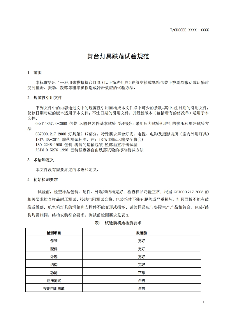 ICS29.140.40CCS K 73T/GDSCEE广东演艺设备行业商会团体标准T/GDSCEE XXXX-XXXX舞台灯具跌落试验规范Specification for drop test of stage lighting fixtures(征求意见稿)(本草案完成时间:2022/5/1)在提交反馈意见时,请将您知道的相关专利连同支特性文件一并附上。XXXX-Xx-XX发布XXXX-x-XX实施广东演艺设备行业商会发布