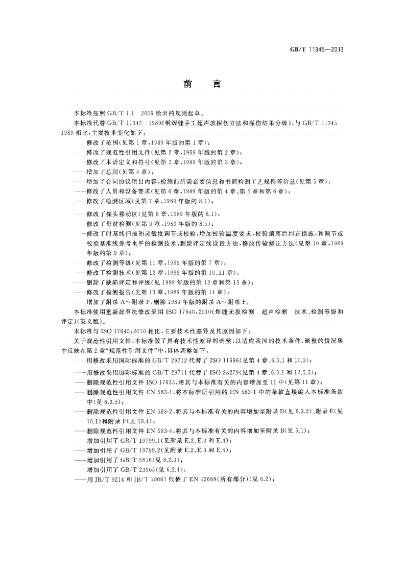 ICS25.160.40j33中华人民共和国国家标准GB/T11345-2013代楼GB/"T11345-1989焊缝无损检测超声检测技术、检测等级和评定Non-destructive testing of welds-Ultrasonic testing-Techniques,testing levels,and assessment(IS017640:2010,MOD)2013-09-18发布2014-06-01实施中华人民共和国国家质量监督检验检疫总局发布中国国家标准化管理委员会