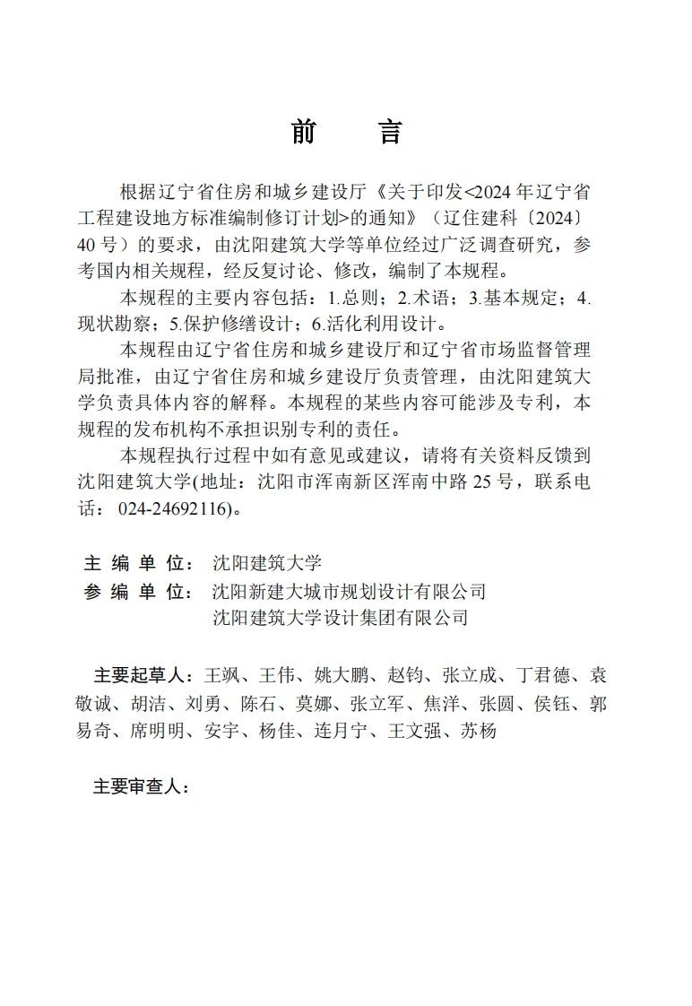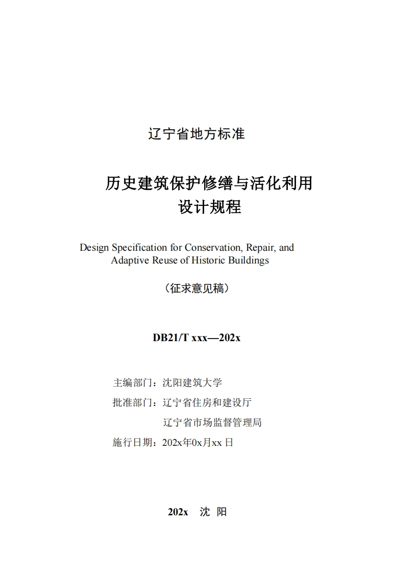 ICS91.040.30DBCCS P------辽宁省地方标准DB21/T xx-202x历史建筑保护修缮与活化利用设计规程Design Specification for Conservation,Repair,andAdaptive Reuse of Historic Buildings(征求意见稿)202x-Xx-Xx发布202x-Xx-Xx实施辽宁省住房和建设厅辽宁省市场监督管理局联合发布