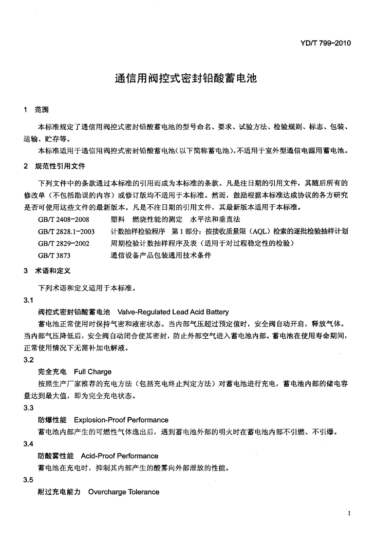 通信用阀控式密封铅酸蓄电池ve-regulatedleadacidbatteriesfortelecommunications_通信用阀控式密封铅酸蓄电池Valve-regulatedleadacidbatteriesfortelecommunications348072@abc2天前发布关注私信0.43MB18页038通信用阀控式密封铅酸蓄电池ve-regulatedleadacidbatteriesfortelecommunications_通信用阀控式密封铅酸蓄电池Valve-regulatedleadacidbatteriesfortelecommunications此内容为付费资源,请付费后查看¥23¥36黄金会员免费钻石会员免费立即购买您当前未登录!建议登陆后购买,可保存购买订单付费资源 第1页 / 共18页 第2页 / 共18页 第3页 / 共18页 第4页 / 共18页 第5页 / 共18页 试读已结束,还剩13页,您可下载完整版后进行离线阅读 THE END标准规范 文本预览 1Cs29.200M41YD中华人民共和国通信行业标准YD/T799-2010代替YDT799-2002通信用阀控式密封铅酸蓄电池Valve-regulated lead acid batteries for telecommunications2010-12-29发布2011-01-01实施中华人民共和国工业和信息化部发布 查看更多 收起部分 喜欢就支持一下吧收藏