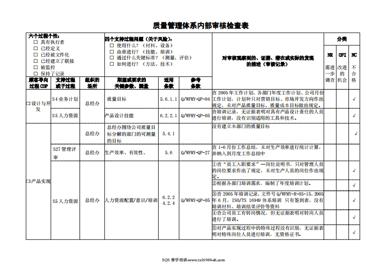 质量管理体系内部审核检查表大个过程个性:▣具有执行者四个支持过程问慧(关于风险):分类口己经定义口使用什么?(材料、设备)口已经被文件化口由谁进行?(技能、培训)口已经建立了联接口通过什么关键标准?(测量、评估)对申核爽列的、正据、着在或实际的发现ROFINC口被监控口如何进行?(方法、技术)的描述(事款记录)需进政进不口保持了记录一步的合客导向支将过短组织的期成复求的适用调查机会格过程COP或子过程场所关然步煮、世乐款①查文件发放记录Q/FY-R-10-12:总经办管理文件汇编Q/FY-C-10发放范围缺少智销部:制造部、财务部吴娟均收到文件,但未在“发S2文件管理总经办①公文性文件管理:②档案管理.4.2.3Q/WFMY-QP-02敢记录表”中签字:②查外来文件管理所有外来文件经过评审,但来建立外来文件接收记①查2005年公司经营计划、技术部、采购部年度工作针划,均形成有效的可控的文件文件:1市场分桐s4业务计划总经办①中、长期经营计划V规划5.6.1.1D/WFY-QP-04②各部门2005年工作计划中,审核人员为:“段军鹏.与顶客要求②监控及钢门工作计划悄全”,经查实肖全为财务部人员,按照Q/FY-QP-O4管理“对各部门工作计划的审核由总经办审核”规定,肖全不具有审核权利。5.5.3言息传递、反馈及时,信息内容准确Q/WFMY-QP-29”””””””””””””””””””皆27、1085产富销售合同,”谷同审对产富茗称测订量、货款支付方式、质量检验标准、包装、违钓和529数据分析总经办信息传递、反馈及时7.5.1.7种裁作了规定,没有对“服务问愿”作出规定。查满信息/数据的可靠、准确4.2.4份合同的“合同评审表”,合同表单没有编号,且没有对缺少此内容评审,结论是“可以签订”另查其它销售合同,均没有对“服务间题”作出规定无证据表明对同行基准水平进行收集并分析8.4.1SQS赛学培制www.tsl6949.h.o四m