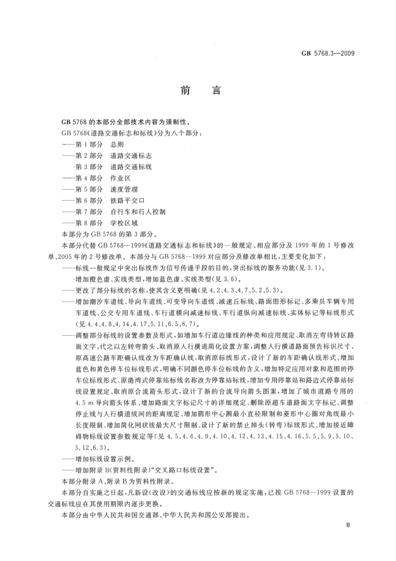 1CS03.220.20R80GB道路交通标志和标线第3部分:道路交通标线中华人民共和国国家标准GB5768.3-2009部分代替GB5768一1999道路交通标志和标线第3部分:道路交通标线Road traffic signs and markings-Part 3:Road traffic markings中国标出版社2009-05-25发布2009-07-01实施中华人民共和国国家质量监督检验检疫总局数码防伪中国国家标准化管理委员会发布