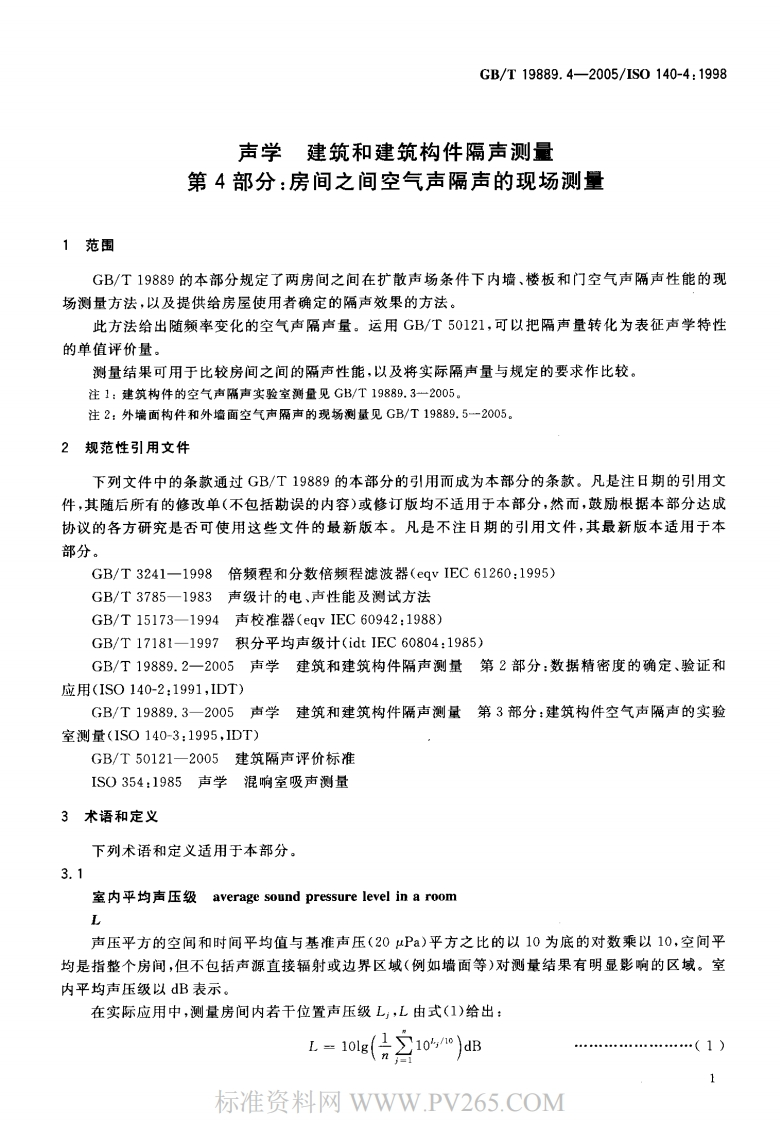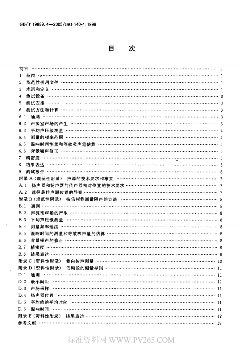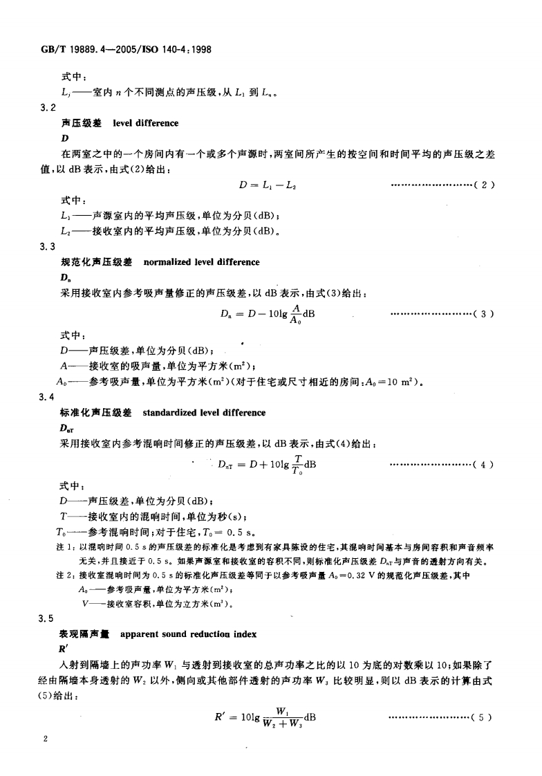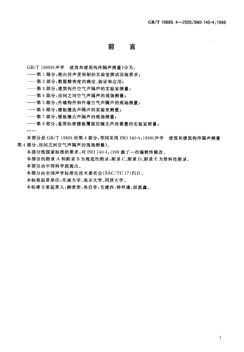 ICs91.120.30A59中华人民共和国国家标准GB/T19889.4一2005/IS0140-4:1998声学建筑和建筑构件隔声测量第4部分:房间之间空气声隔声的现场测量Acoustics-Measurement of sound insulation in buildings and of building elements-Part 4:Field measurements of airborne sound insulation between rooms(ISO140-4:1998,IDT)2005-09-09发布2006-04-01实施中华人民共和国国家质量监督检验检疫总局中国国家标准化管理委员会发布