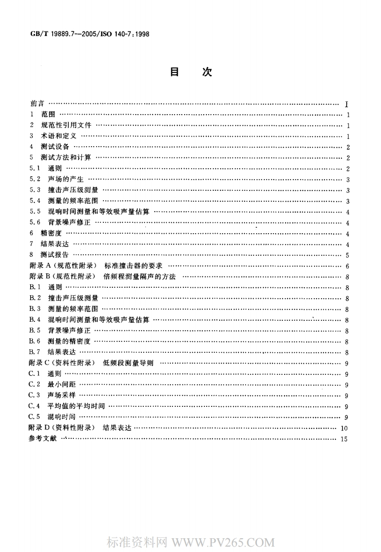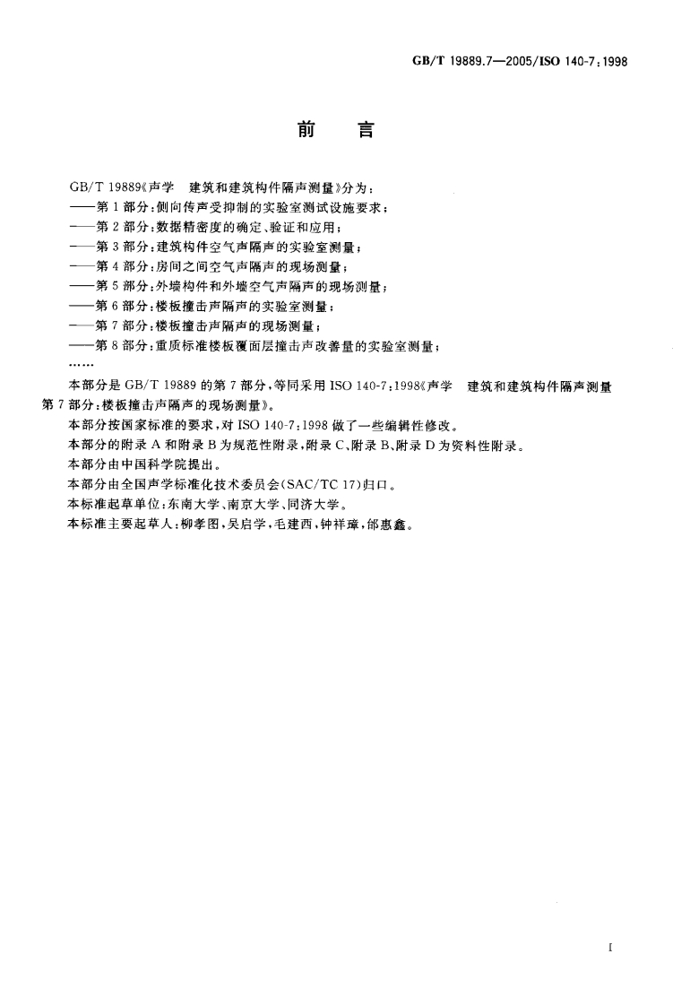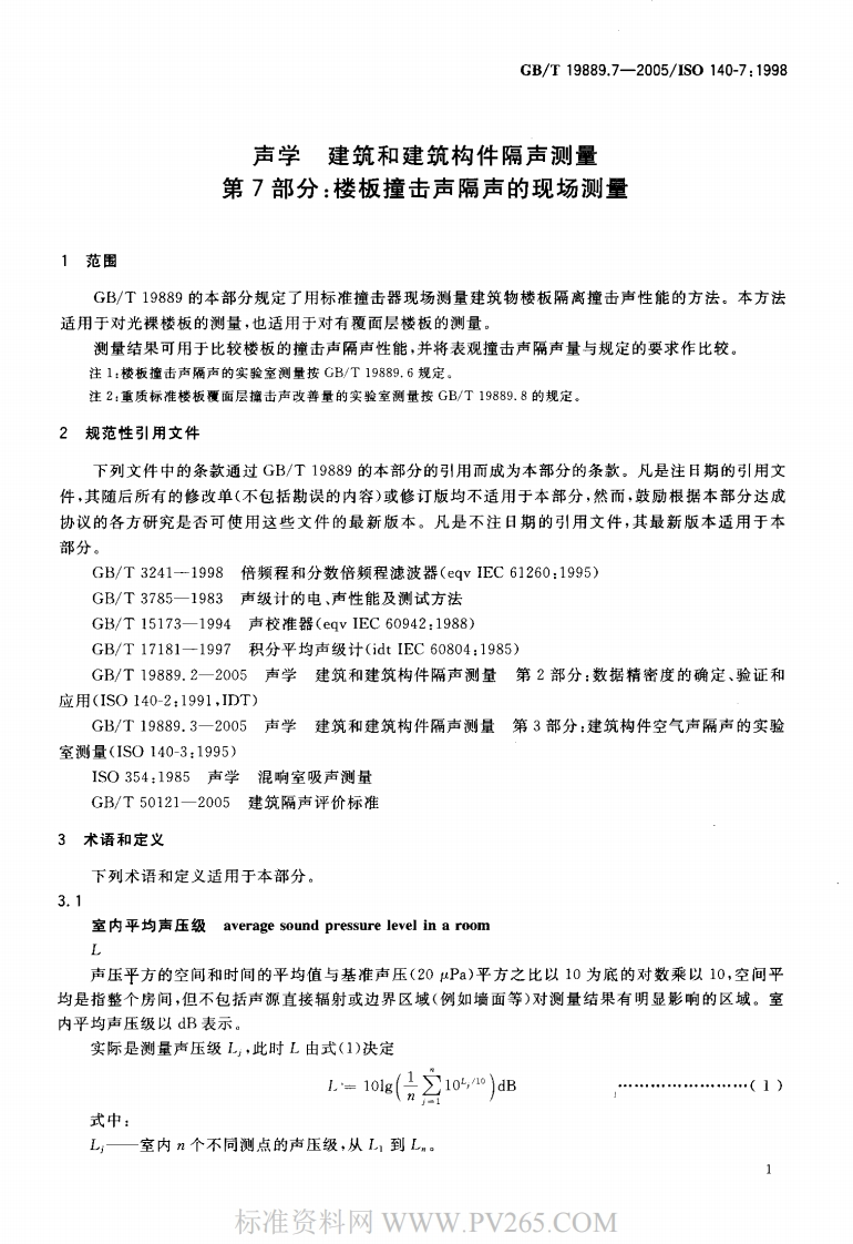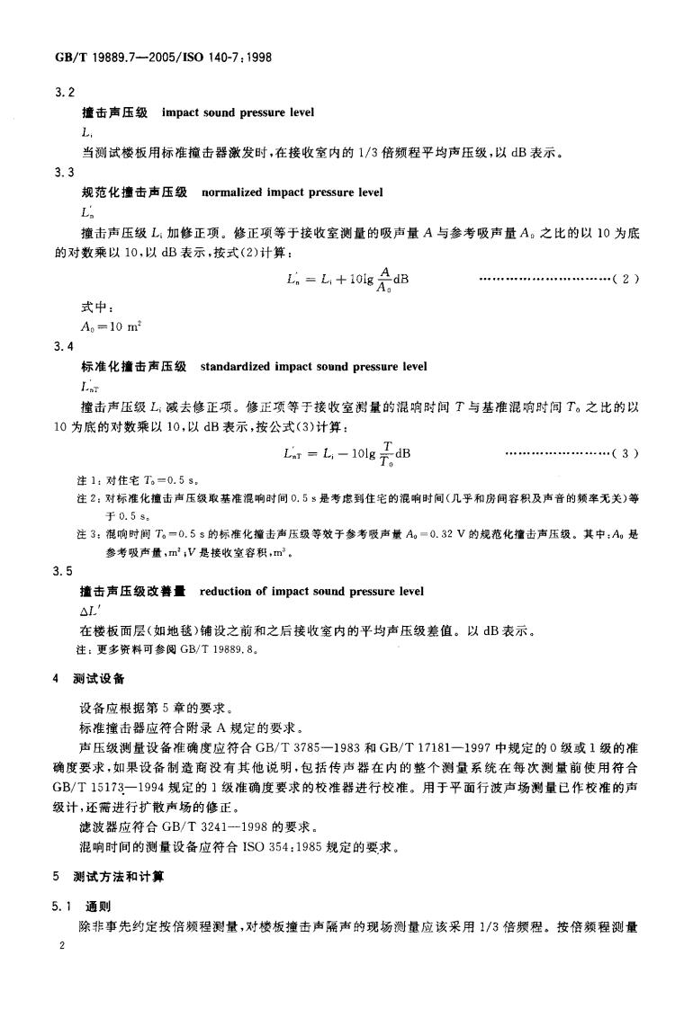 CS91.120.30A59中华人民共和国国家标准GB/T19889.7一2005/1S0140-7:1998声学建筑和建筑构件隔声测量第7部分:楼板撞击声隔声的现场测量Acoustics-Measurement of sound insulation in buildings and of building elements-Part 7:Field measurements of impact sound insulation of floors(ISO140-7:1998,IDT)2005-07-29发布2006-04-01实施中华人民共和国国家质量监督检验检疫总局中国国家标准化管理委员会发布