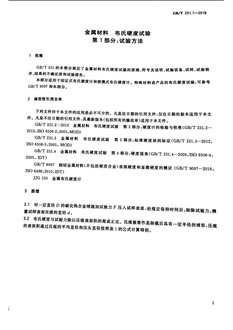 1CS77.040.10H2266-5GB中华人民共和国国家标准GB/T231.1-2018代帮GB/T231.1—2009金属材料布氏硬度试验第1部分:试验方法Metallic materials-Brinell hardness test-Part 1:Test method(IS06506-1:2014,M0D)2018-05-14发布2019-02-01实施国家市场监督管理总局中国国家标准化管理委员会发布
