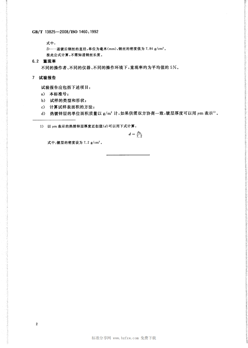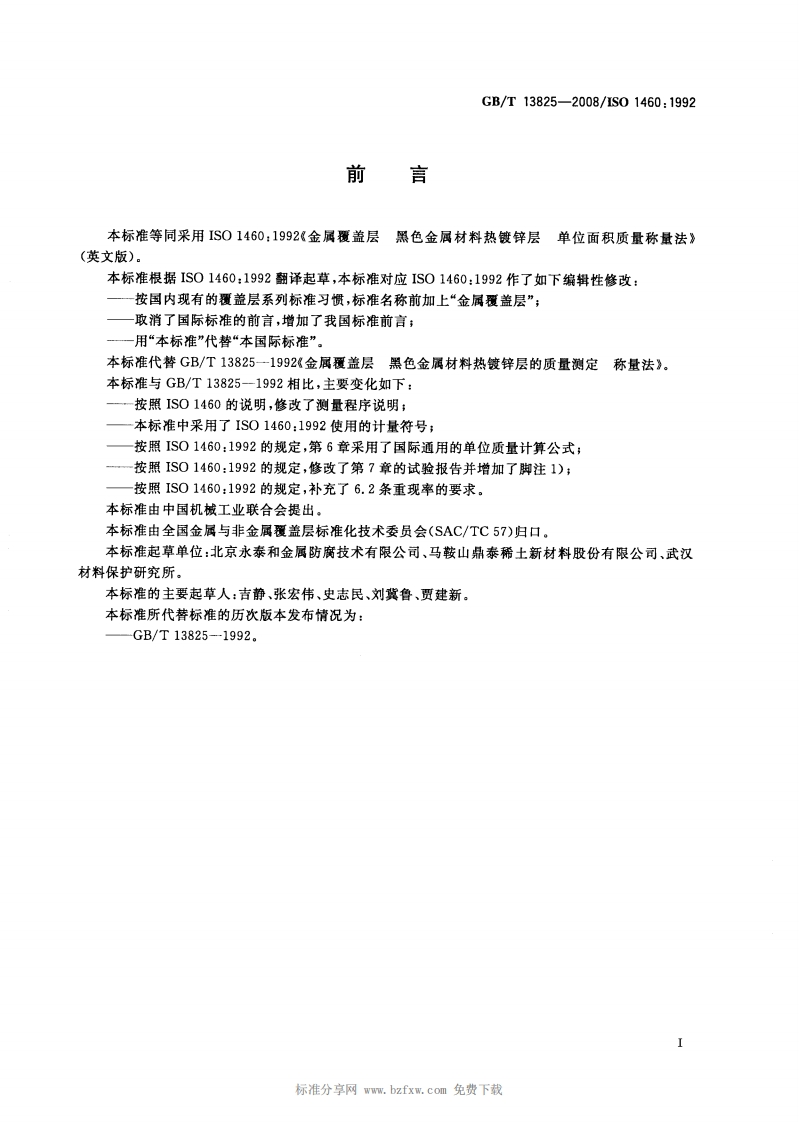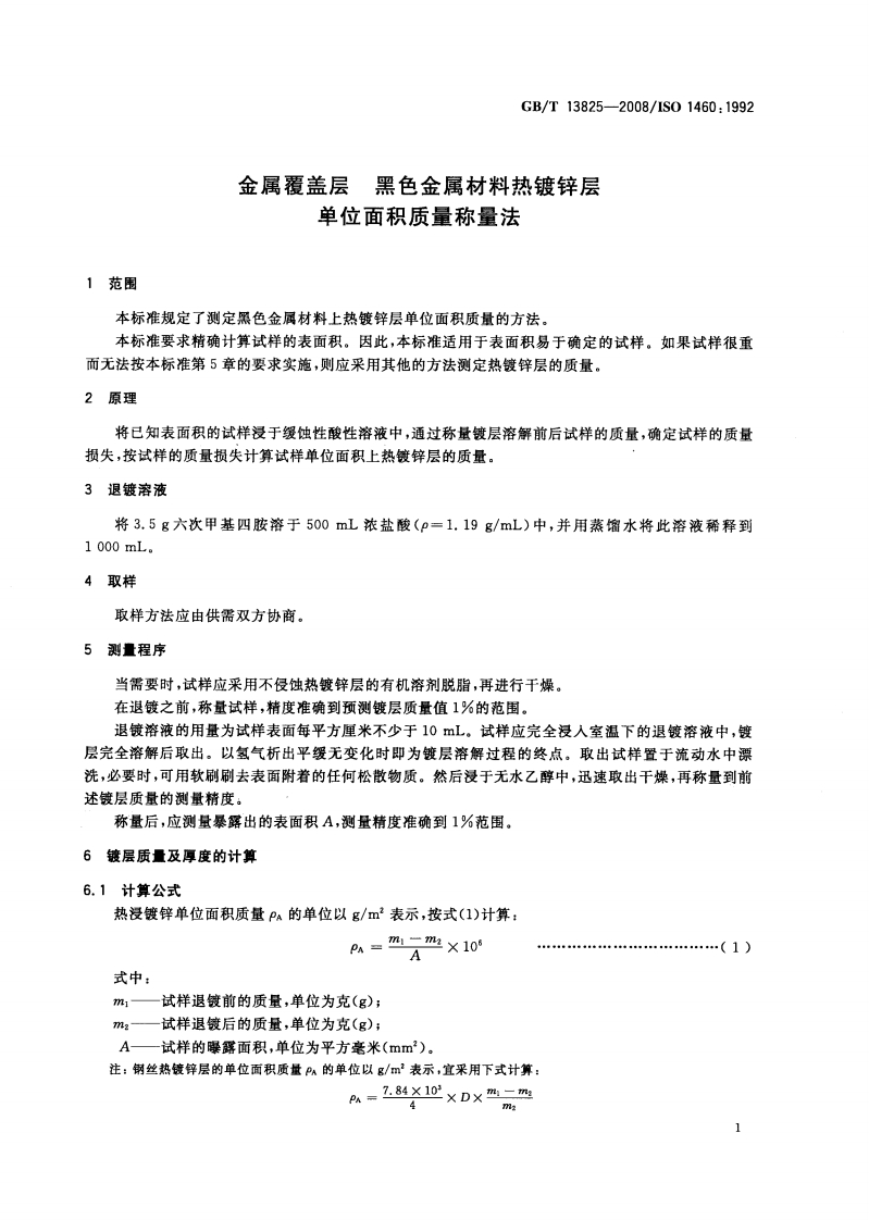 ICS25.220.40A29中华人民共和国国家标准GB/T13825-2008/1S01460:1992代替GB/T13825-1992金属覆盖层黑色金属材料热镀锌层单位面积质量称量法Metallic coatings-Hot dip galvanized coatings onferrous materials-Gravimetric determination of the mass per unit area(IS01460:1992,IDT)2008-06-19发布2009-01-01实施中华人民共和国国家质量监督检验检疫总局中国国家标准化管理委员会发布