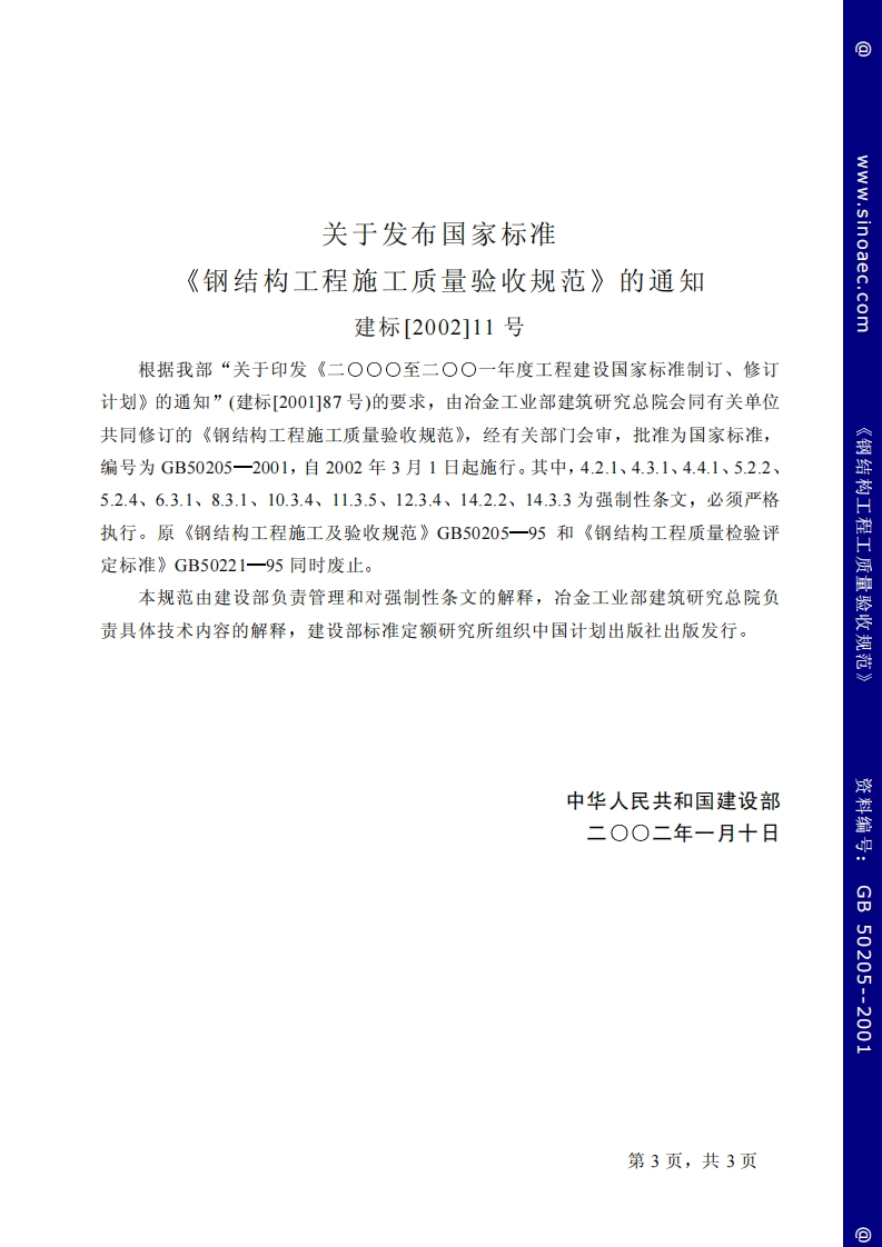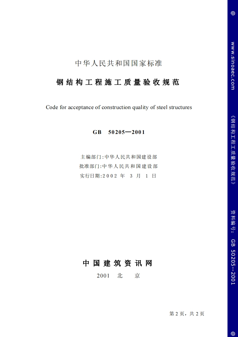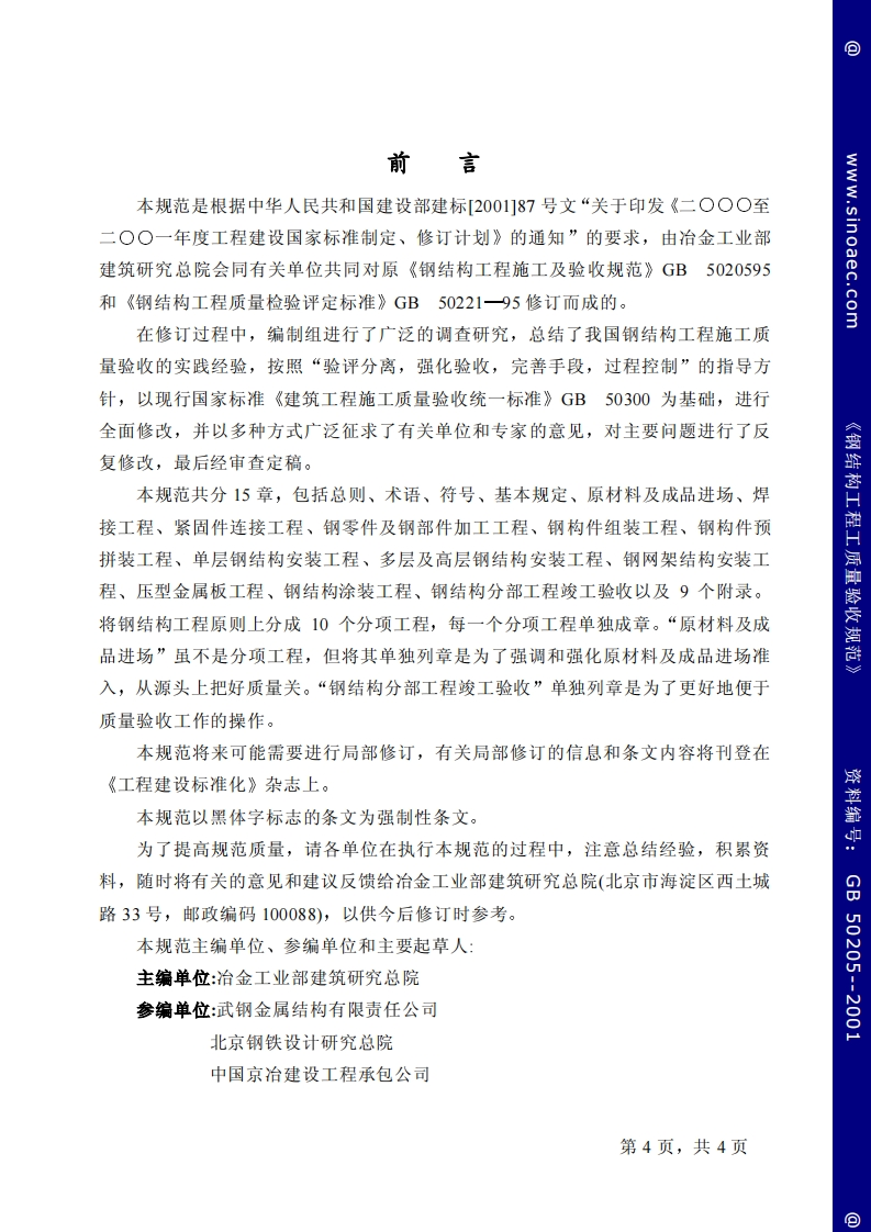 钢结构工程施工质量验收规范348072@abc前天发布关注私信0.91MB106页037钢结构工程施工质量验收规范此内容为付费资源,请付费后查看¥23¥36黄金会员免费钻石会员免费立即购买您当前未登录!建议登陆后购买,可保存购买订单付费资源 第1页 / 共106页 第2页 / 共106页 第3页 / 共106页 第4页 / 共106页 第5页 / 共106页 试读已结束,还剩101页,您可下载完整版后进行离线阅读 THE END标准规范 文本预览 回UDC中华人民共和国国家标准PGB50205-2001www.sinoaec.com钢结构工程施工质量验收规范Code for acceptance of construction quality of steel structures2002-01一10发布2002—03—01实施中华人民共和国国家质量监督检验检疫总局中华人民共和国建设部联合发布B50205--2001第1页,共1页包 查看更多 收起部分 喜欢就支持一下吧收藏