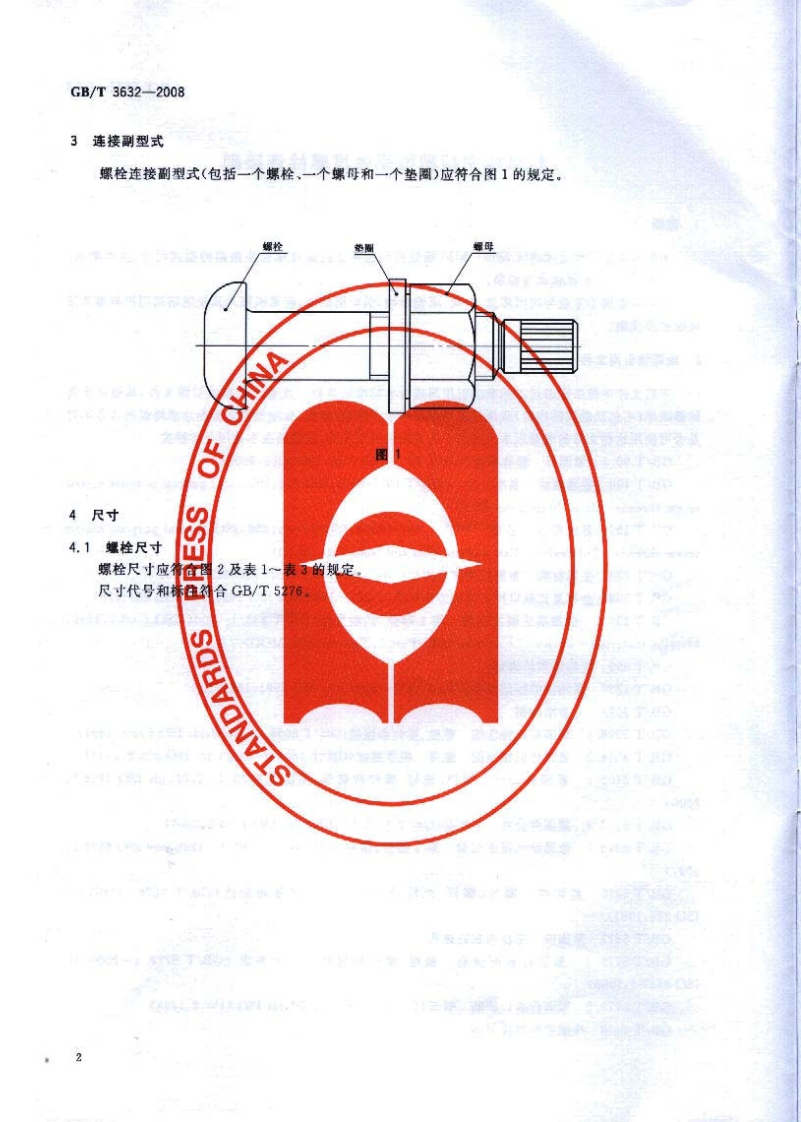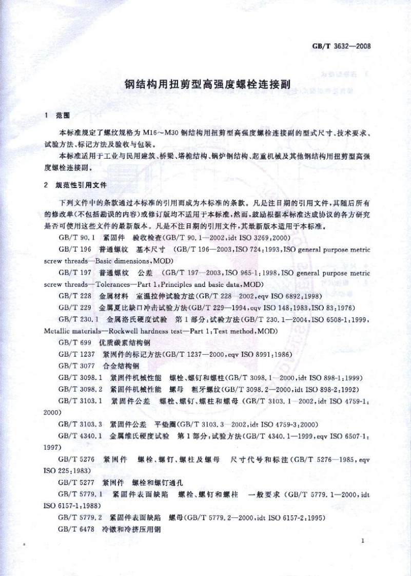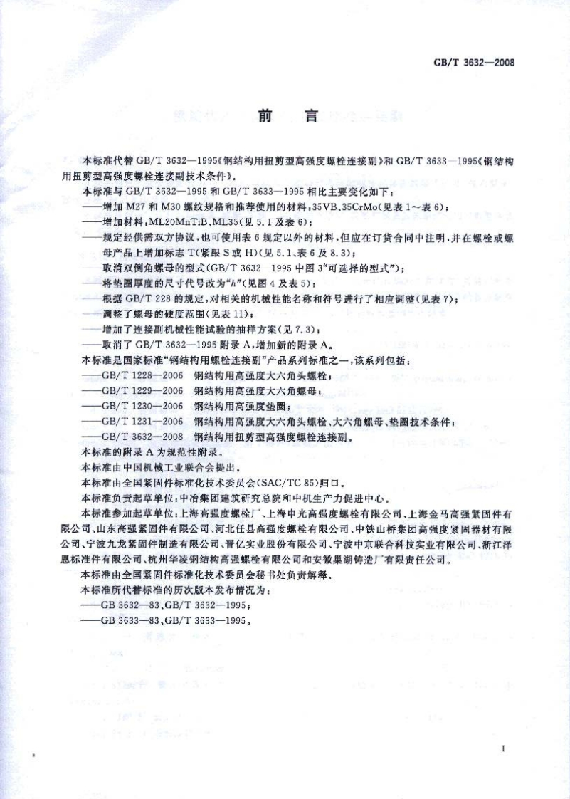 1CS21.060.10J13中华人民共和国国家标准GB/T3632-2008代替GB/T3632~3633一1995钢结构用扭剪型高强度螺栓连接副Sets of torshear type high strength bolt hexagon nut andplain washer for steel structures2008-03-03发布2008-07-01实施中华人民共和国国家质量监督检验检疫总局中国国家标准化管理委员会发布