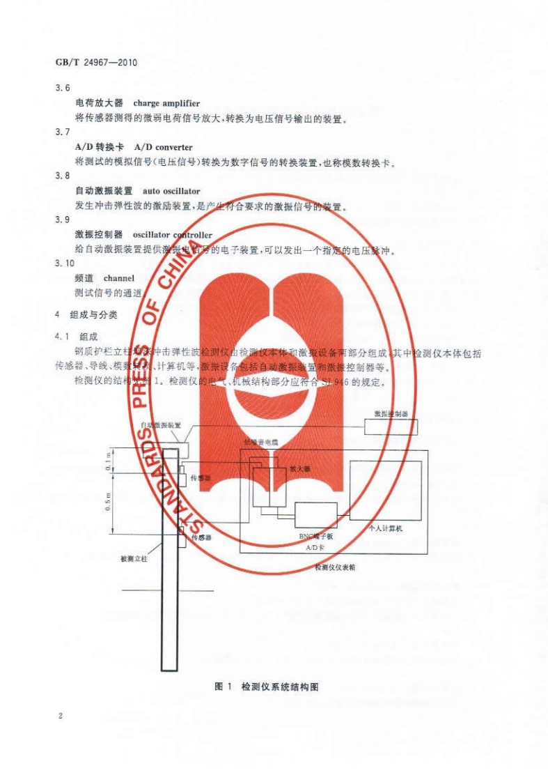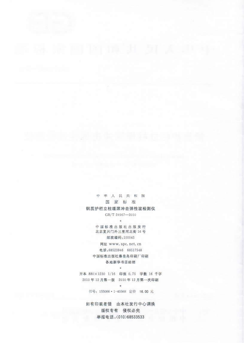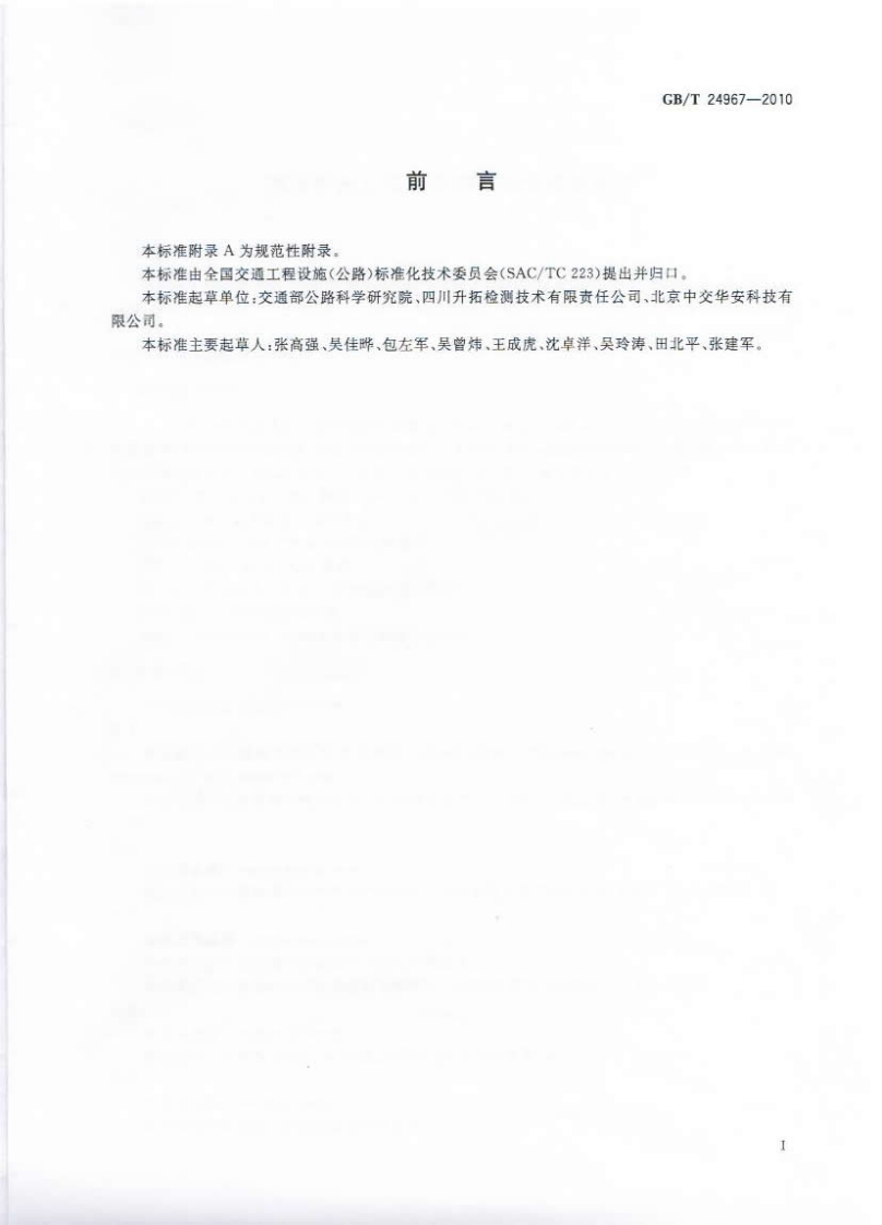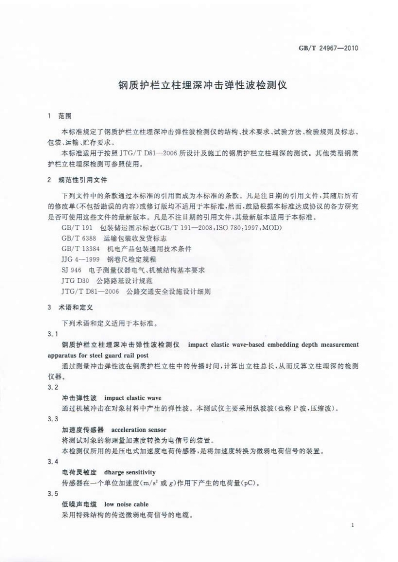 钢质护栏立柱埋深冲击弹性波检测仪Impactelasticwave-basedembeddingdepthmeasurementapparatusforsteelguardrailpost348072@abc前天发布关注私信1.01MB11页030钢质护栏立柱埋深冲击弹性波检测仪Impactelasticwave-basedembeddingdepthmeasurementapparatusforsteelguardrailpost此内容为付费资源,请付费后查看¥23¥36黄金会员免费钻石会员免费立即购买您当前未登录!建议登陆后购买,可保存购买订单付费资源 第1页 / 共11页 第2页 / 共11页 第3页 / 共11页 第4页 / 共11页 第5页 / 共11页 试读已结束,还剩6页,您可下载完整版后进行离线阅读 THE END标准规范 文本预览 ICS03.220.20R86中华人民共和国国家标准GB/T24967-2010钢质护栏立柱埋深冲击弹性波检测仪Impact elastic wave-based embedding depth measurementapparatus for steel guard rail post2010-08-09发布2010-12-01实施中华人民共和国国家质量监督检验检疫总局中国国家标准化管理委员会发布 查看更多 收起部分 喜欢就支持一下吧收藏