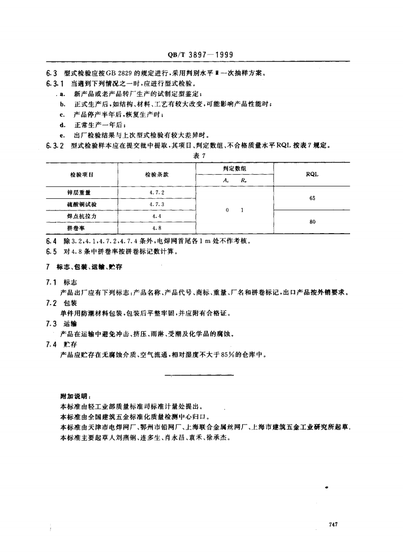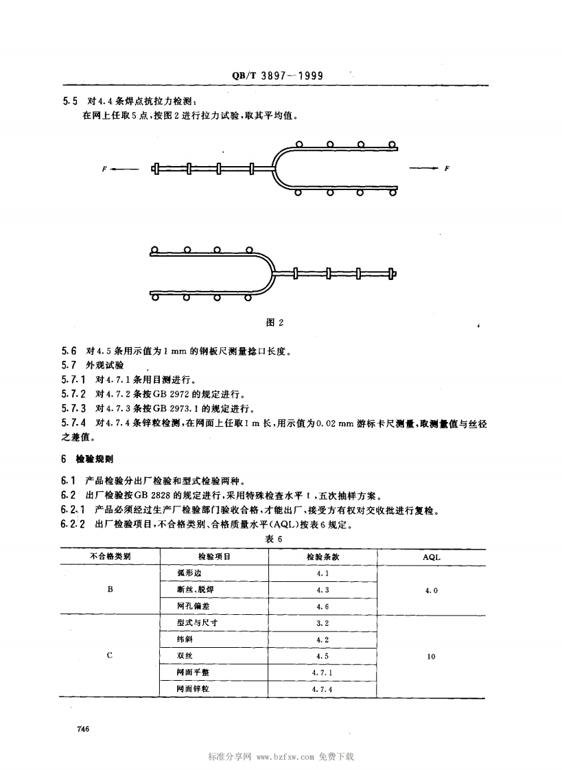 中华人民共和国轻工行业标准镀锌电焊网QB/T3897-1999Welded wire fabric coated with zine1主题内容与适用范因·本标准规定了镀锌电焊网产品分类、技术要求、试验方法、检验规则、标志,包装、运输、贮存。本标准适用于建筑,种植、养殖、围栏等用途的镀锌电焊网(以下简称电焊网)。2引用标准GB2828逐批检查计数抽样程序及抽样表(适用于连续批的检查)GB2829周期检查计数抽样程序及抽样表(适用于生产过程稳定性的检查)GB2972镀锌钢丝锌层硫酸铜试验方法GB2973.1镀锌钢丝锌层重量试验方法重量法3产品分类3.1产品代号DHW DX JX W丝径×经向网孔长×纬向网孔长镀锌电焊网标记示例:丝径0.70mm,经向网孔长12.7mm,纬向网孔长12.7mm的镀锌电焊网表示为:DHw0.70×12.70×12.703.2型式与尺寸3.2.1电焊网型式按图1规定:图1B一网宽:D一丝径:L一网长C一网边磊头长:J一经向网孔长:W一纬向网孔长国款轻工业局1999-04-21批准1999-04-21实施T48
