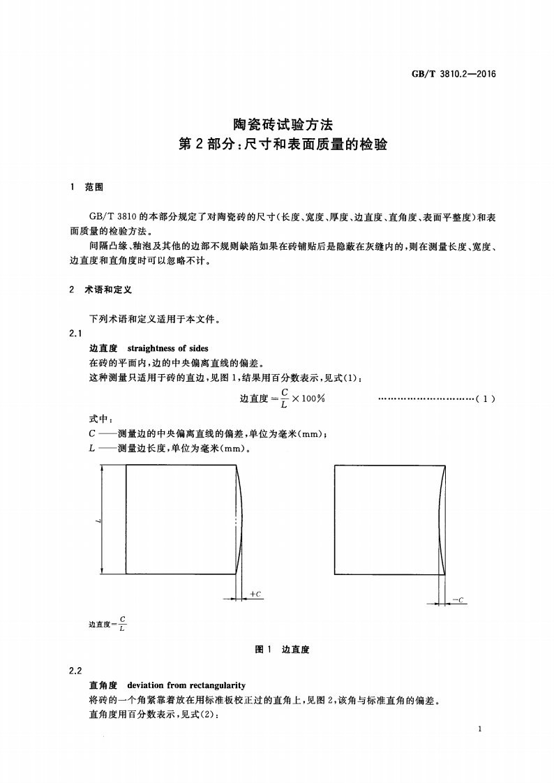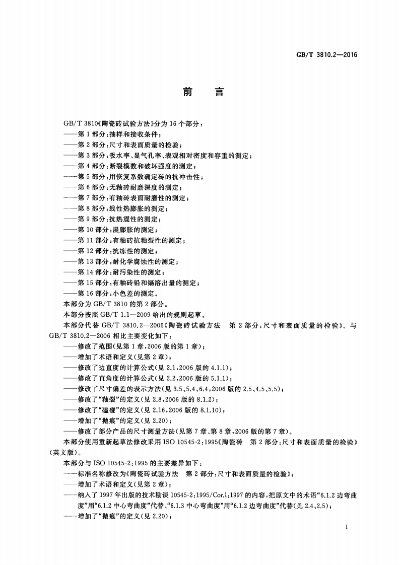 1CS91.100.25Q31中华人民共和国国家标准GB/T3810.2-2016代替GB/T3810.2一2006陶瓷砖试验方法第2部分:尺寸和表面质量的检验Test methods of ceramic tiles-Part 2:Determination of dimensions andsurface quality(ISO 10545-2:1995,Ceramic tiles-Part 2:Determination ofdimensions and surface quality,MOD)2016-04-25发布2017-03-01实施中华人民共和国国家质量监督检验检疫总局中国国家标准化管理委员会发布