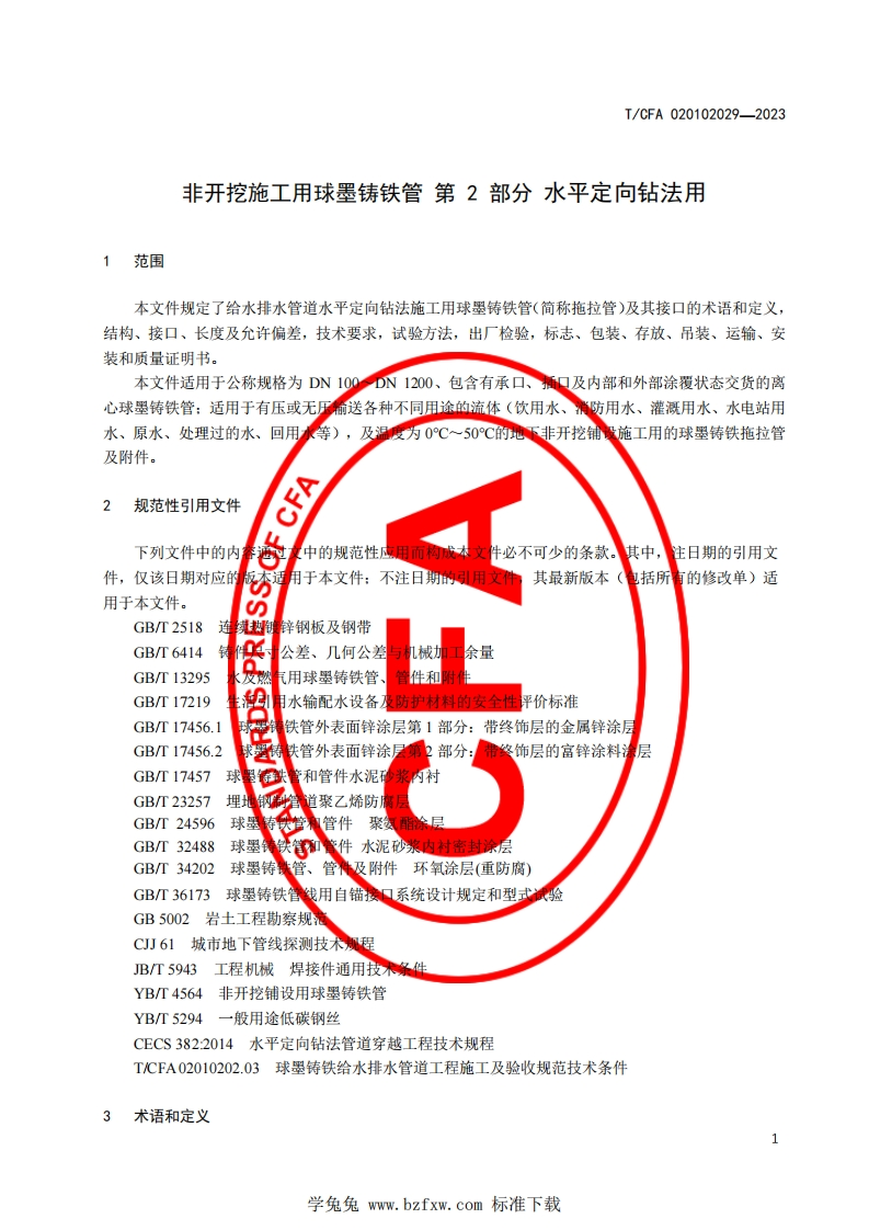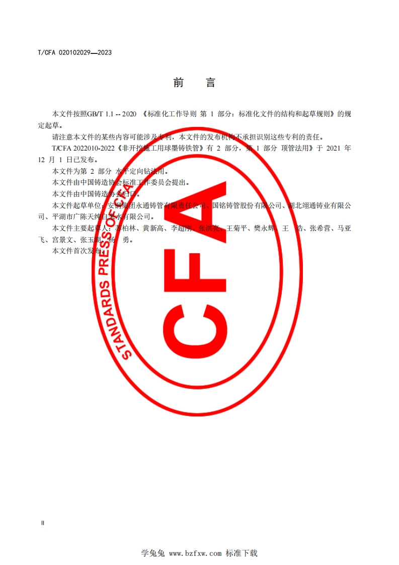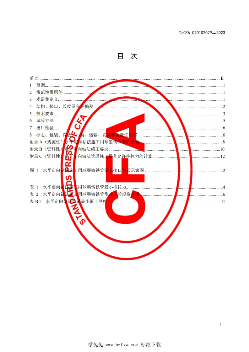 1Cs23.040.10CCS J31团体标准T/CFA020102029—2023非开挖施工用球墨铸铁管第2部分:水平定向钻法用Ductile iron pipes for trenchless construction-part 2:used for horizontal directional drilling method2023-03-01发布2023-06-01实施中国铸造协会发布学兔兔www.bzfxw.com标准下载