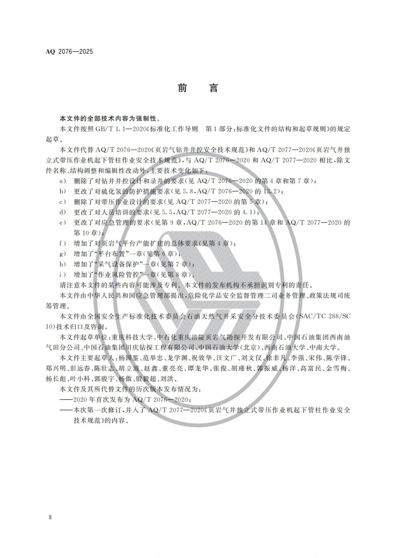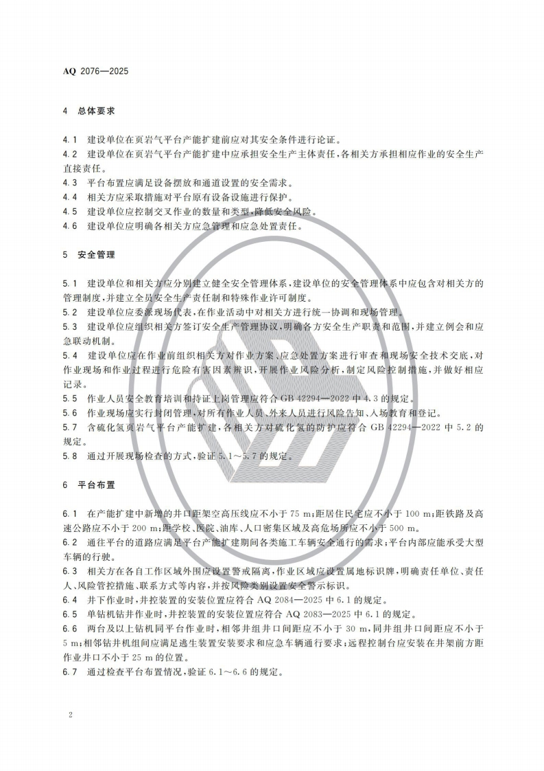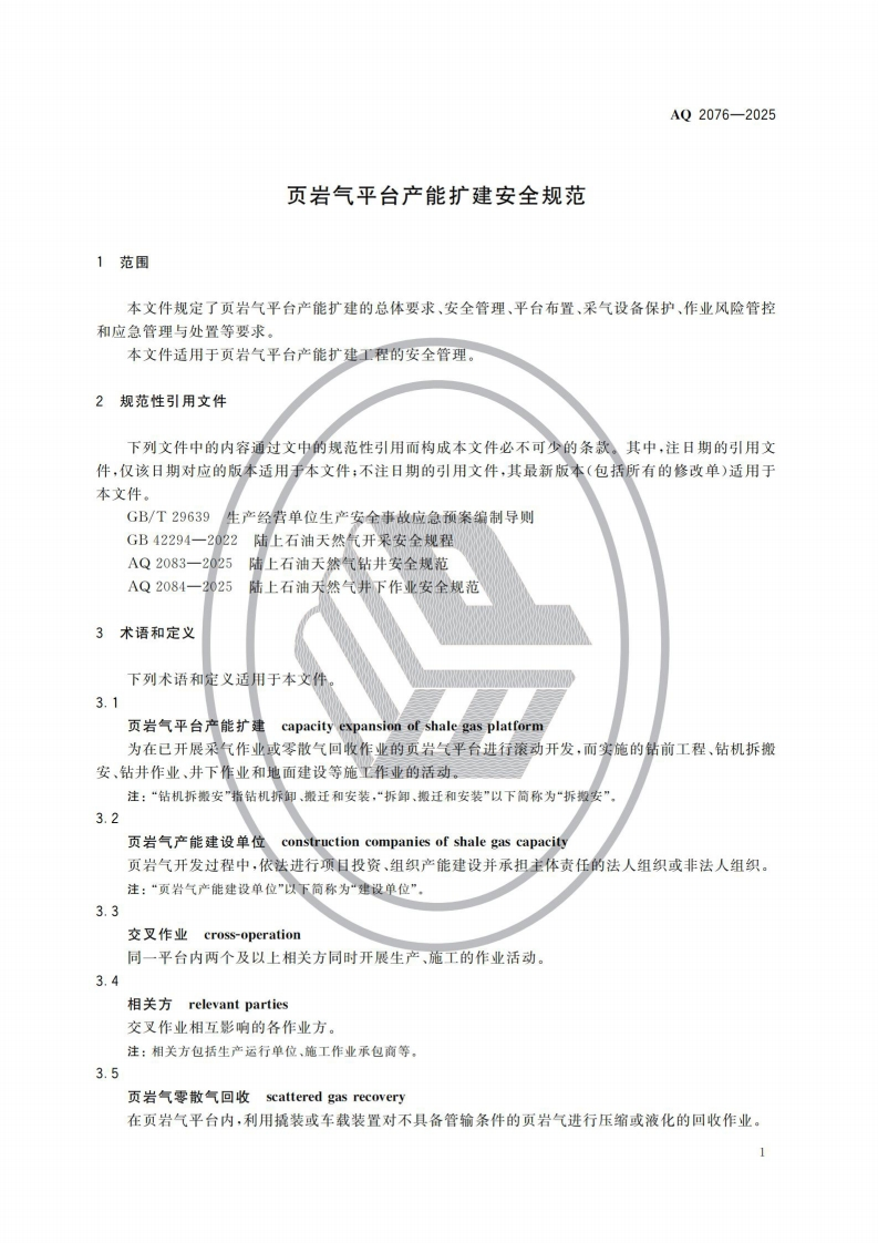 页岩气平台产能扩建安全规范Safetyspecificationsforcapacityexpansionofshalegasplatform348072@abc前天发布关注私信1.78MB7页021页岩气平台产能扩建安全规范Safetyspecificationsforcapacityexpansionofshalegasplatform此内容为付费资源,请付费后查看¥23¥36黄金会员免费钻石会员免费立即购买您当前未登录!建议登陆后购买,可保存购买订单付费资源 第1页 / 共7页 第2页 / 共7页 第3页 / 共7页 第4页 / 共7页 第5页 / 共7页 试读已结束,还剩2页,您可下载完整版后进行离线阅读 THE END标准规范 文本预览 1CS13.100CCS E 09AQ中华人民共和国安全生产行业标准AQ2076一2025代替AQ/T2076-2020、AQ/T2077一2020页岩气平台产能扩建安全规范Safety specifications for capacity expansion of shale gas platform2025-12-13发布2026-07-01实施中华人民共和国应急管理部发布 查看更多 收起部分 喜欢就支持一下吧收藏