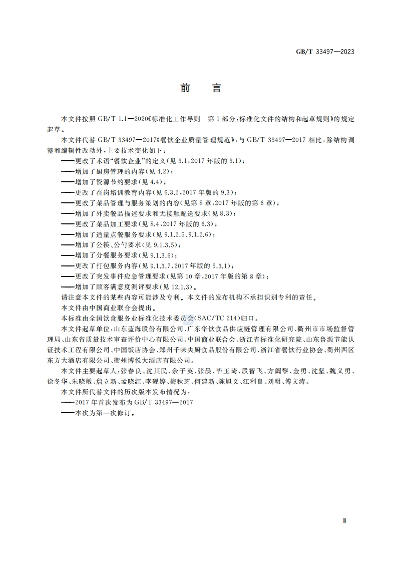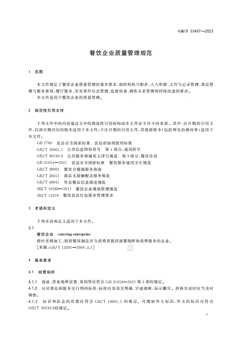 餐饮企业质量管理规范Specificationforqualitymanagementofcateringenterprise348072@abc前天发布关注私信0.95MB13页021餐饮企业质量管理规范Specificationforqualitymanagementofcateringenterprise此内容为付费资源,请付费后查看¥23¥36黄金会员免费钻石会员免费立即购买您当前未登录!建议登陆后购买,可保存购买订单付费资源 第1页 / 共13页 第2页 / 共13页 第3页 / 共13页 第4页 / 共13页 第5页 / 共13页 试读已结束,还剩8页,您可下载完整版后进行离线阅读 THE END标准规范 文本预览 1CS03.120.10CCS A 00B中华人民共和国国家标准GB/T33497一2023代替GB/T33497一2017餐饮企业质量管理规范Specification for quality management of catering enterprise2023-06-09发布2023-06-09实施国家市场监督管理总局发布国家标准化管理委员会 查看更多 收起部分 喜欢就支持一下吧收藏