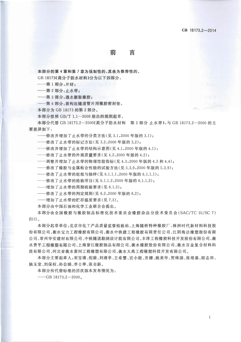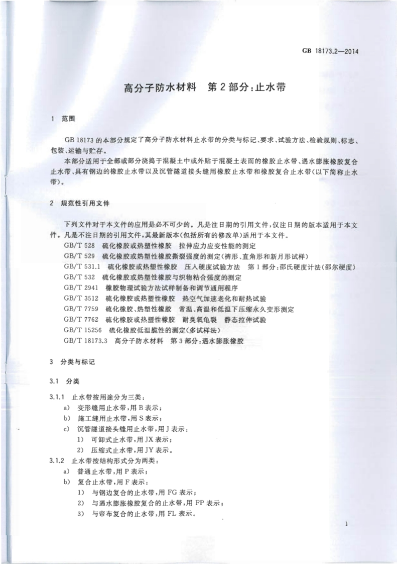 高分子防水材料第2部分_止水带Polymerwater-proofmaterials-Part2_waterstop348072@abc前天发布关注私信0.49MB11页024高分子防水材料第2部分_止水带Polymerwater-proofmaterials-Part2_waterstop此内容为付费资源,请付费后查看¥23¥36黄金会员免费钻石会员免费立即购买您当前未登录!建议登陆后购买,可保存购买订单付费资源 第1页 / 共11页 第2页 / 共11页 第3页 / 共11页 第4页 / 共11页 第5页 / 共11页 试读已结束,还剩6页,您可下载完整版后进行离线阅读 THE END标准规范 文本预览 1CS83.140.99G47GB中华人民共和国国家标准GB18173.2-2014代替GB18173.2一2000高分子防水材料第2部分:止水带Polymer water-proof materials-Part 2:waterstop2014-07-24发布2015-05-01实施中华人民共和国国家质量监督检验检疫总局中国国家标准化管理委员会发布数码游仿 查看更多 收起部分 喜欢就支持一下吧收藏