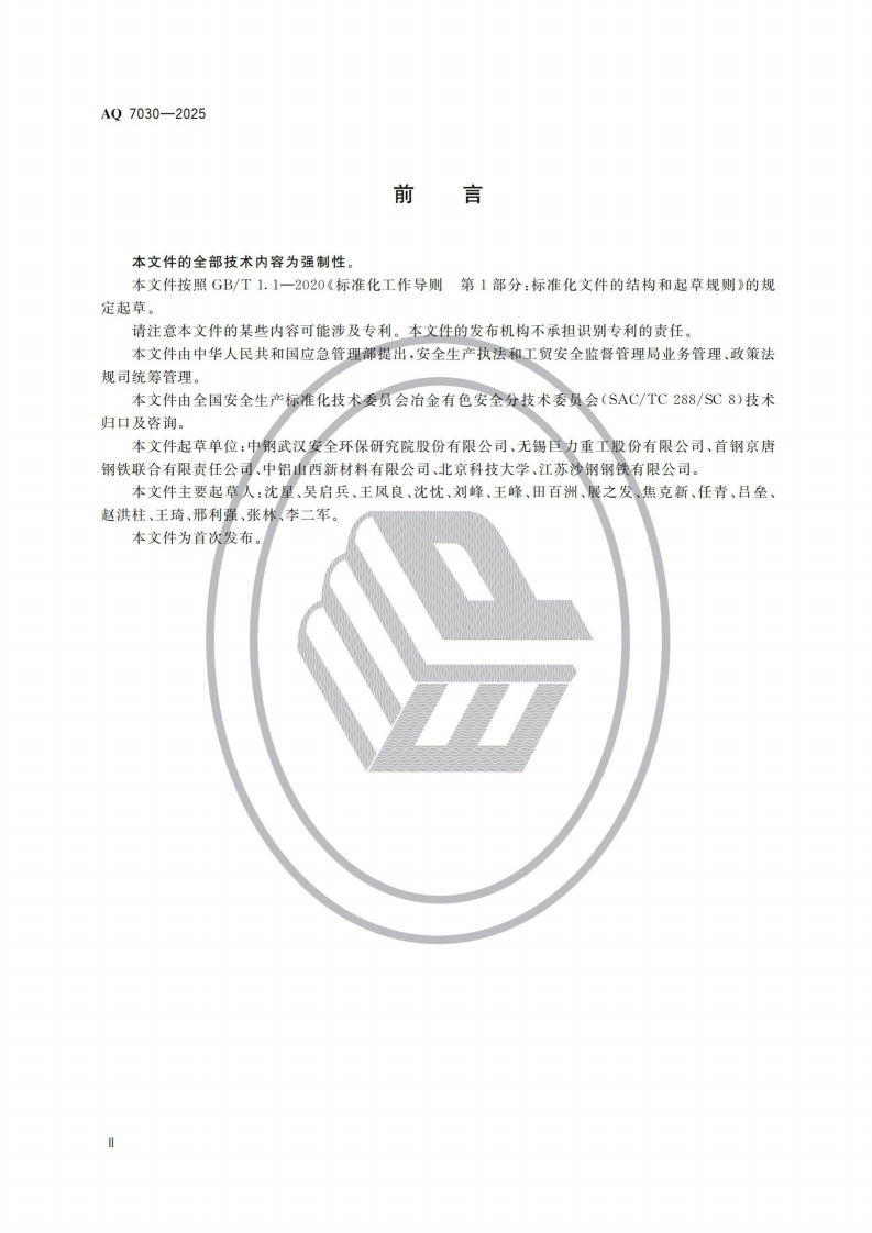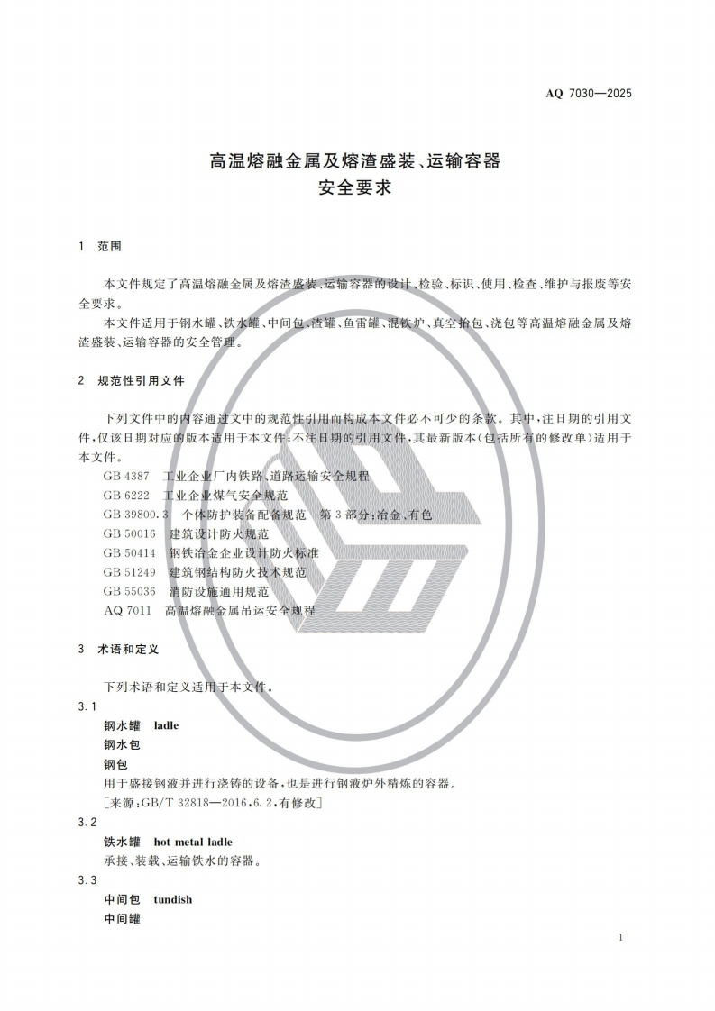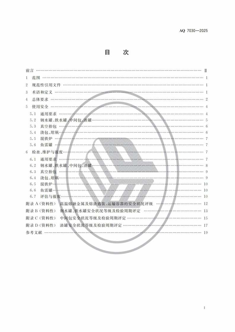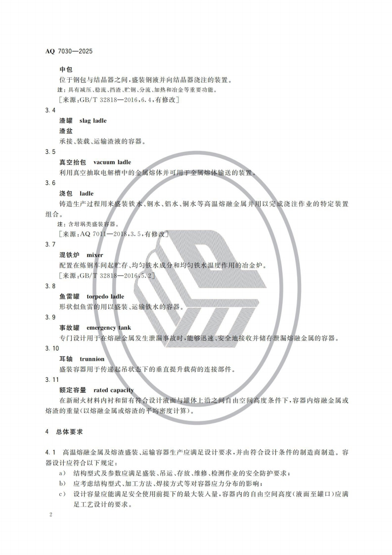 高温熔融金属及熔渣盛装、运输容器安全要求Safetyrequirementsforcontainersforcontainingandtransportinghigh-temperaturemoltenmetalandslag348072@abc前天发布关注私信6.05MB22页029高温熔融金属及熔渣盛装、运输容器安全要求Safetyrequirementsforcontainersforcontainingandtransportinghigh-temperaturemoltenmetalandslag此内容为付费资源,请付费后查看¥23¥36黄金会员免费钻石会员免费立即购买您当前未登录!建议登陆后购买,可保存购买订单付费资源 第1页 / 共22页 第2页 / 共22页 第3页 / 共22页 第4页 / 共22页 第5页 / 共22页 试读已结束,还剩17页,您可下载完整版后进行离线阅读 THE END标准规范 文本预览 1CS77.180CCS H 92AQ中华人民共和国安全生产行业标准AQ7030一2025高温熔融金属及熔渣盛装、运输容器安全要求Safety requirements for containers for containing and transportinghigh-temperature molten metal and slag2025-11-14发布2026-06-01实施中华人民共和国应急管理部发布 查看更多 收起部分 喜欢就支持一下吧收藏