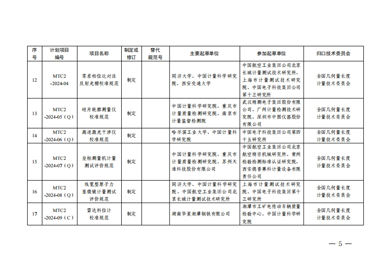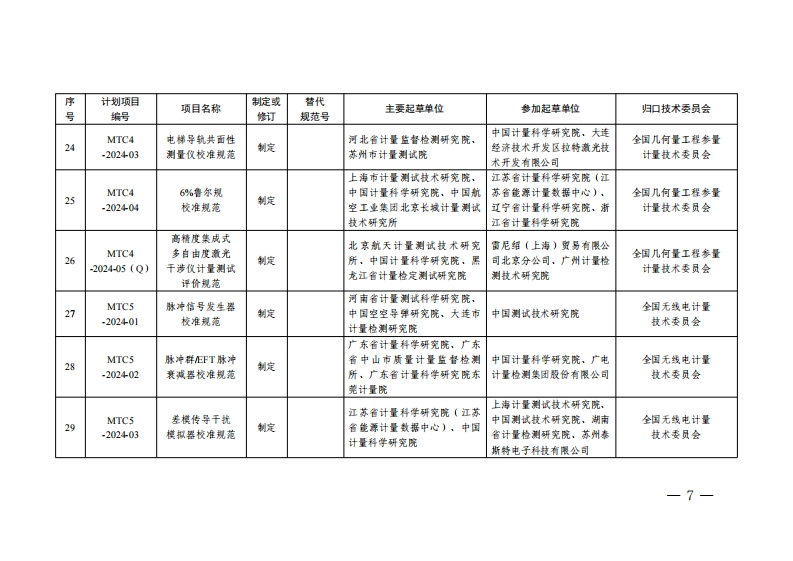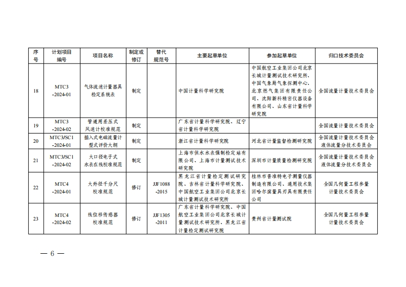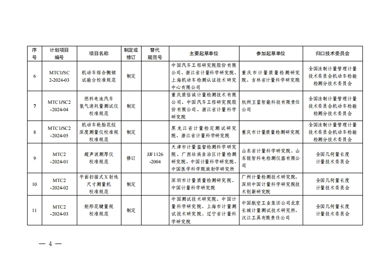 2024年国家计量技术规范制定、修订计划序计划项目项目名称制定或替代主要起草单位参加起草单位归口技术委员会号编号修订规范号连续累计自动衡器MTCI(皮带秤)OML制定中国计量科学研究院全国法制计量管理-202401试验规范计量技术委员会山东省计量科学研究院、中国MTCI电子计价释生产衡器协会,中国计量科学研究全国法制计量管理2能力计量保障要求制定院、渐江省计量科学研究院,福建省计量科学研究院-202402计量技术委员会江苏省计量科学研究院(江苏省能源计量数据中心)MTCI燃消加消机生产中国计量协会,北京市计量检全国法制计量管理3-202403能力计量保障要求制定测科学研究院计量技术委员会MTCI/SC2机动车制动操银力JF1169渐江省计量科学研究院、甘肃上海西派埃自动化仪表工程全国法制计量管理计量修订有限责任公司,石家庄华燕技术委员会机动车检验-202401计校准规范-2007省计量研究院交通科技有限公司检测分技术委员会上海机动车检测认证技术研究中国汽车工程研究院股份有燃料电池汽车中心有限公司、重庆质信诚计限公司,氢澈科技(天津)全国法制计量管理计量MTCI/SC2-202402氢气样放分析仪制定量检测技术有限公司,中汽研有限公司,内蒙古自治区计技术委员会机动车检验校准规范汽车检验中心(天津)有限公量测试研究院、渐江省计量检测分技术委员会司科学研究院-3-