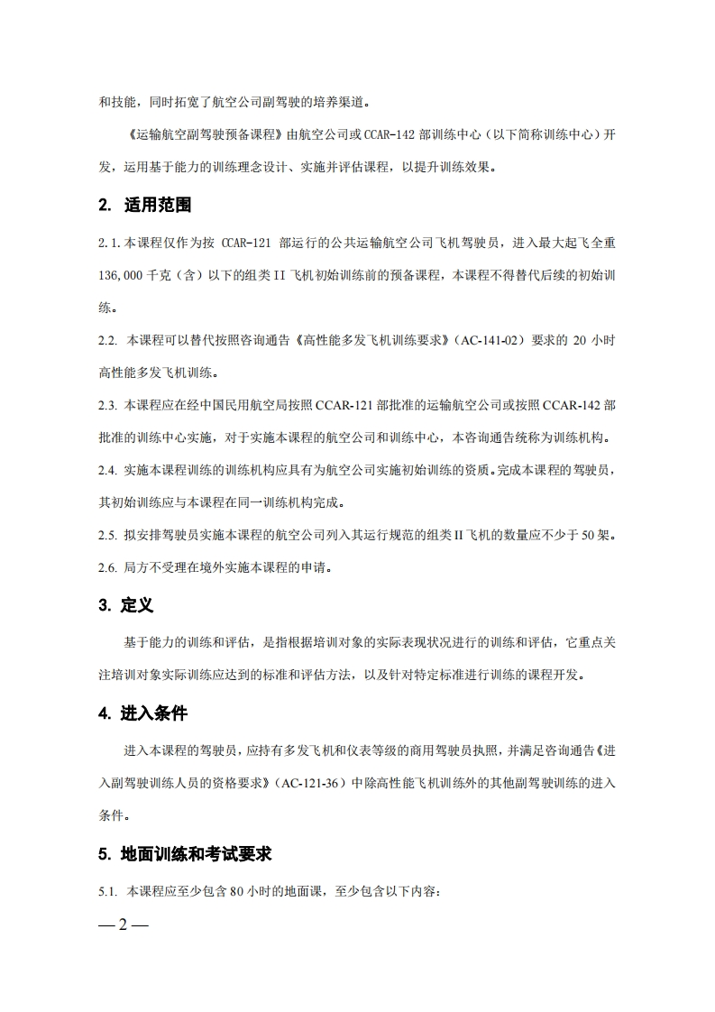 中国民用航空局飞行标准司编号:AC-121-FS-2015-126咨询通告下发日期:2015年11月27日编制部门:FS批准人:胡振江运输航空副驾驶预备课程1.背景传统的商用驾驶员执照训练是在低空、低速、单个驾驶员操作、设备简单的单发或多发活塞发动机飞机上进行的.其主要目的是为通用航空培养飞行员,与CCAR-121部运输航空公司(以下简称航空公司)的高空、高速、多人制机组的现代商用运输飞机所需飞行员的能力具有较大差异。为了弥补这样的能力差距,中国民用航空局要求进入航空公司进行组类Ⅱ飞机初始训练的副驾驶应完成高性能多发飞机训练课程。该训练为副驾驶提供了航空公司所需要的知识、技能、态度,为运输航空的运行安全和持续发展做出了贡献。随着模拟机技术的不断发展,在国际民航组织的推动下,使用模拟设备培养合格的飞行员逐渐被行业接受,通过发挥模拟设备的优势,不仅有利于训练安全的保证,而且可以达到甚至高于真实飞机的训练效果。如CCAR-61部所批准的多人制机组驾驶员执照(MPL),其训练方式己取得成功并已经得到航空公司的认可。在这种新的训练理念下,通过航空公司的深度参与,使用模拟设备替代真实飞机,可以开发出更加符合航空公司运行需求的训练课程,更好的补充副驾驶在进入初始训练前所需的知识