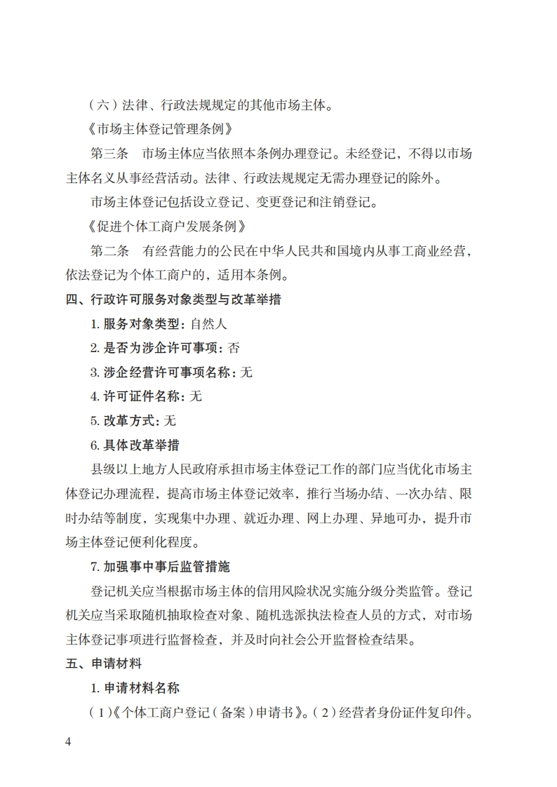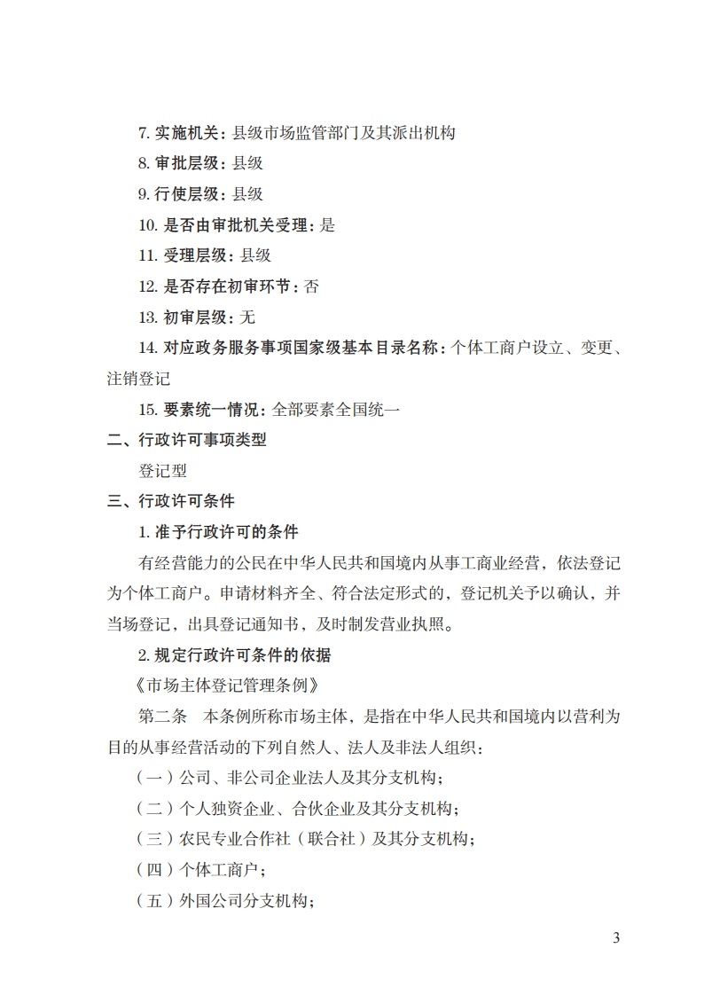 28个体工商户登记注册实施规范348072@abc8小时前发布关注私信0.24MB10页03528个体工商户登记注册实施规范此内容为付费资源,请付费后查看¥32¥39黄金会员免费钻石会员免费立即购买您当前未登录!建议登陆后购买,可保存购买订单付费资源 第1页 / 共10页 第2页 / 共10页 第3页 / 共10页 第4页 / 共10页 第5页 / 共10页 试读已结束,还剩5页,您可下载完整版后进行离线阅读 THE END标准规范 文本预览 28个体工商户登记注册实施规范(基本要素)一、行政许可事项名称:个体工商户登记注册二、中央主管部门:市场监管总局三、实施机关:县级市场监管部门四、设定和实施依据:《市场主体登记管理条例》《市场主体登记管理条例实施细则》《促进个体工商户发展条例》五、子项:无 查看更多 收起部分 喜欢就支持一下吧收藏
