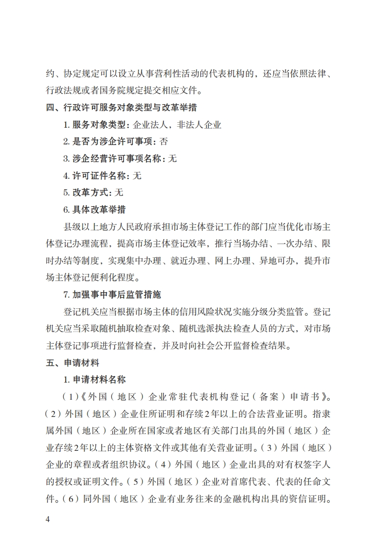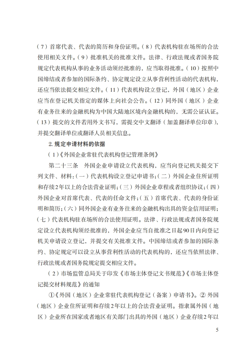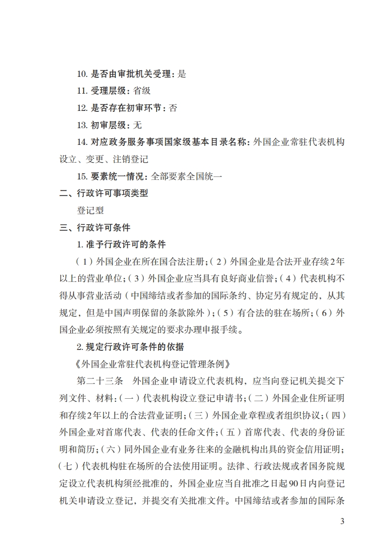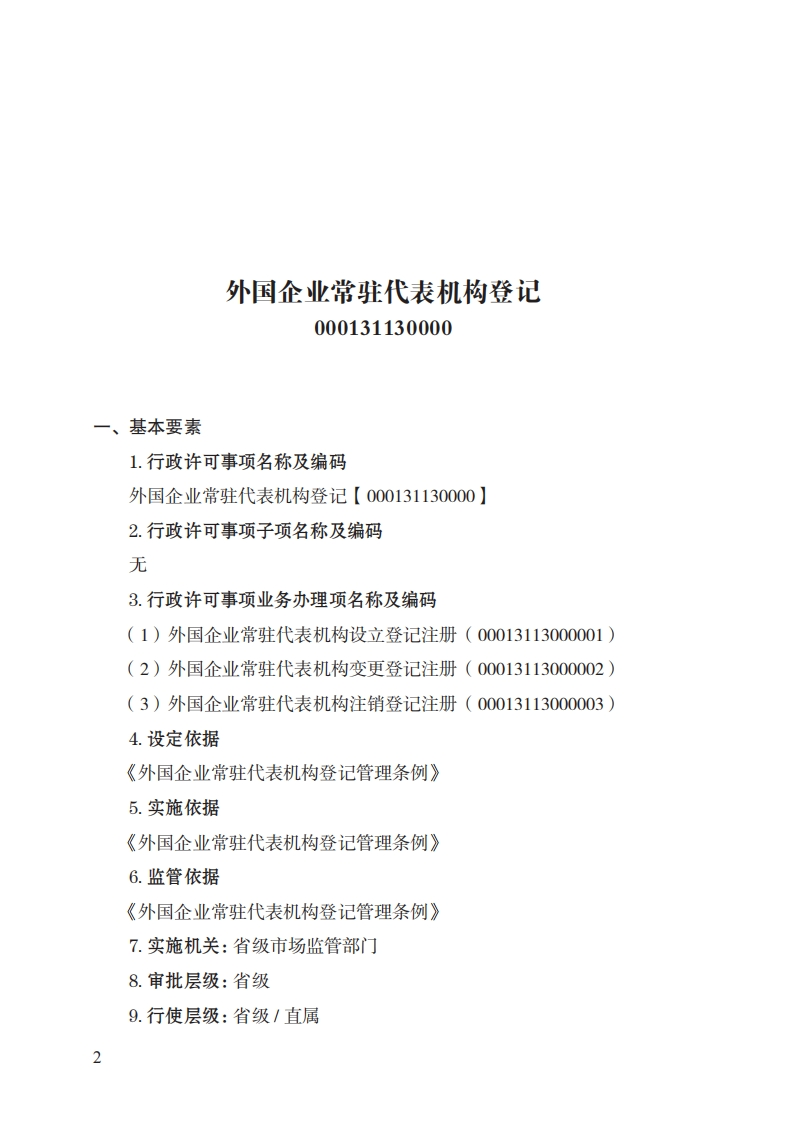 30外国企业常驻代表机构登记实施规范348072@abc6小时前发布关注私信0.24MB10页02530外国企业常驻代表机构登记实施规范此内容为付费资源,请付费后查看¥32¥39黄金会员免费钻石会员免费立即购买您当前未登录!建议登陆后购买,可保存购买订单付费资源 第1页 / 共10页 第2页 / 共10页 第3页 / 共10页 第4页 / 共10页 第5页 / 共10页 试读已结束,还剩5页,您可下载完整版后进行离线阅读 THE END标准规范 文本预览 30外国企业常驻代表机构登记实施规范(基本要素)一、行政许可事项名称:外国企业常驻代表机构登记二、中央主管部门:市场监管总局三、实施机关:省级市场监管部门四、设定和实施依据:《外国企业常驻代表机构登记管理条例》五、子项:无 查看更多 收起部分 喜欢就支持一下吧收藏