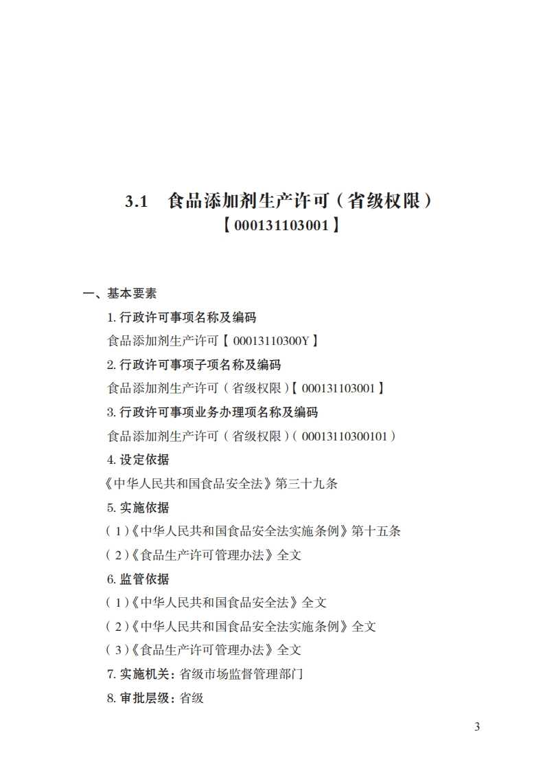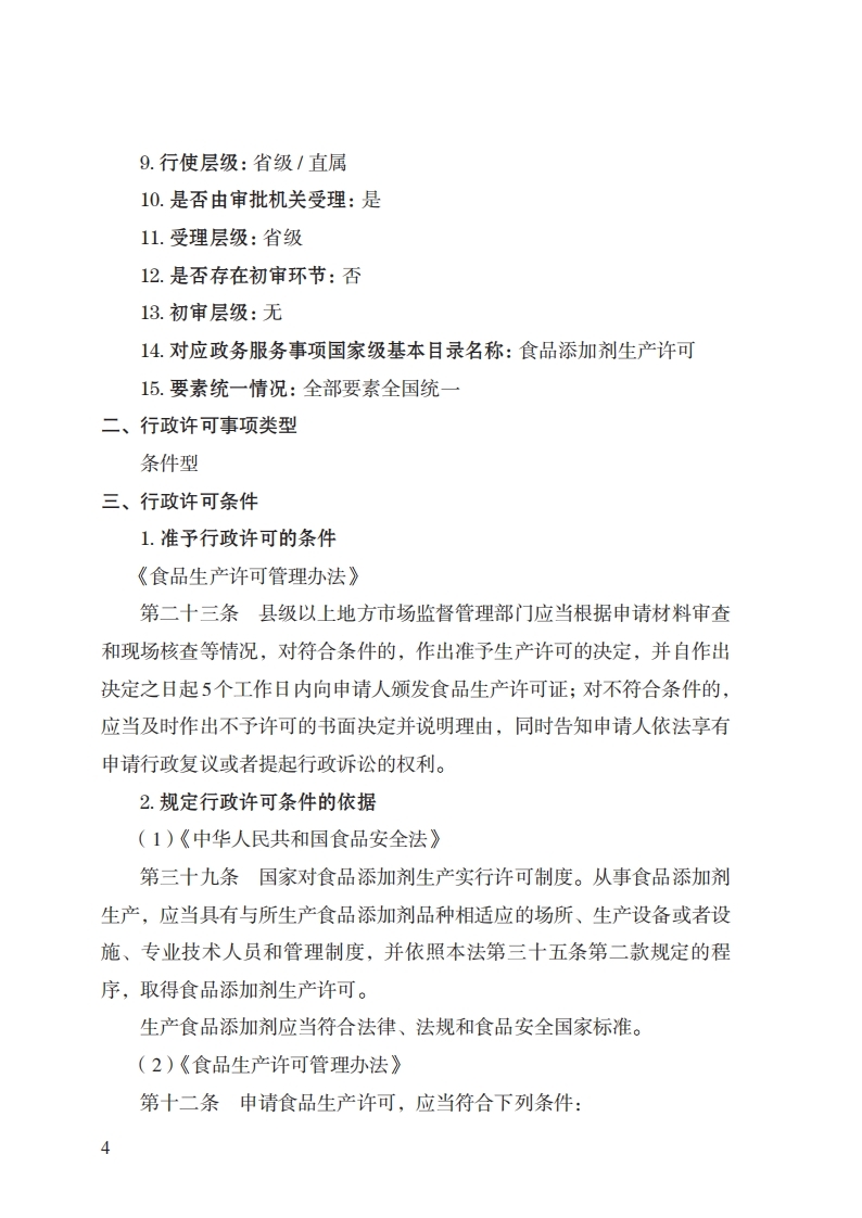 3食品添加剂生产许可实施规范(基本要素)一、行政许可事项名称:食品添加剂生产许可二、中央主管部门:市场监管总局三、实施机关:省级、设区的市级、县级市场监管部门四、设定和实施依据:1.《中华人民共和国食品安全法》第三十九条国家对食品添加剂生产实行许可制度。从事食品添加剂生产,应当具有与所生产食品添加剂品种相适应的场所、生产设备或者设施、专业技术人员和管理制度,并依据本法第三十五条第二款规定的程序,取得食品添加剂生产许可。2.《中华人民共和国食品安全法实施条例》第十五条食品生产经营许可的有效期为5年。食品生产经营者的生产经营条件发生变化,不再符合食品生产经营1