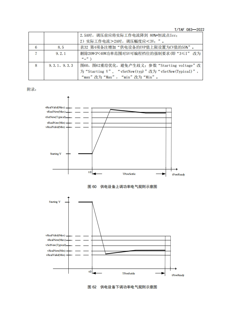 T/TAF083-2022电信终端产业协会团体标准修改通知单T/TAF083一2022《移动终端融合快速充电技术规范》第1号修改单一、编辑性修改序号标准条文号内容16.4.6“充电设备后续应以57600bs波特率发送消总”改为“供电设备后续应以57600bps波特率发送消息”7.2.4.13图38 Test_Requesti消息结构原内容有误,“厂家ID”改为“Test_Request'”,数据“1~253字节”改为“2字节”。酒琴特(e鲶ai)二、技术性修改序号标准条文号内容(如无特殊说明,修政内容适用于版本1.0及后续版本)15.2.2表4中的“0.5V”改为“0.6V”。26.4.6增加“如果要切换波特率的话,发起方只用pig消息通知对方切换波特率。”:27.2.2b)消息编号原内容删除,改为“设备在接收消息的时候,不判断消息编号是否变化。建议设备在发送消息的时候,消息编号都设置为0。”(注意:以下修改内容仅适用于版本1.01)协议版本编号由“000001b”改为“010001b”,“初始版本1.0”改为“版本1.01”,c)协议版本增加描述“V1.01版本内容,对应版本编号为010001b,为保证兼容性,低2bit指代大版本V1,中间2bit指代中版本0,高2bit指代小版本1:”。7.2.4.5(注意:以下修改内容适用于版本1.01及后续版本)图30线缆信息由“8字节”改为“10字节”b)数据长度:“8个字节”改为“10个字节”,数据长度设置为“8”改为“10”:表20:“63…48”改为“79…64”,“47…32”改为“63…48”,“15…8”改为“31…16”,“7…0”改为“15…0”,“单位1V”改为“单位10mV”,“单位1A”改为“单位10mA”。58.2.2.4增加“调整功率时需要遵循以下要求:1)调压幅度≥V时:恒流点Icc>2.5A时,调压前应将实际工作电流降到2A及以下:恒流点IcC≤