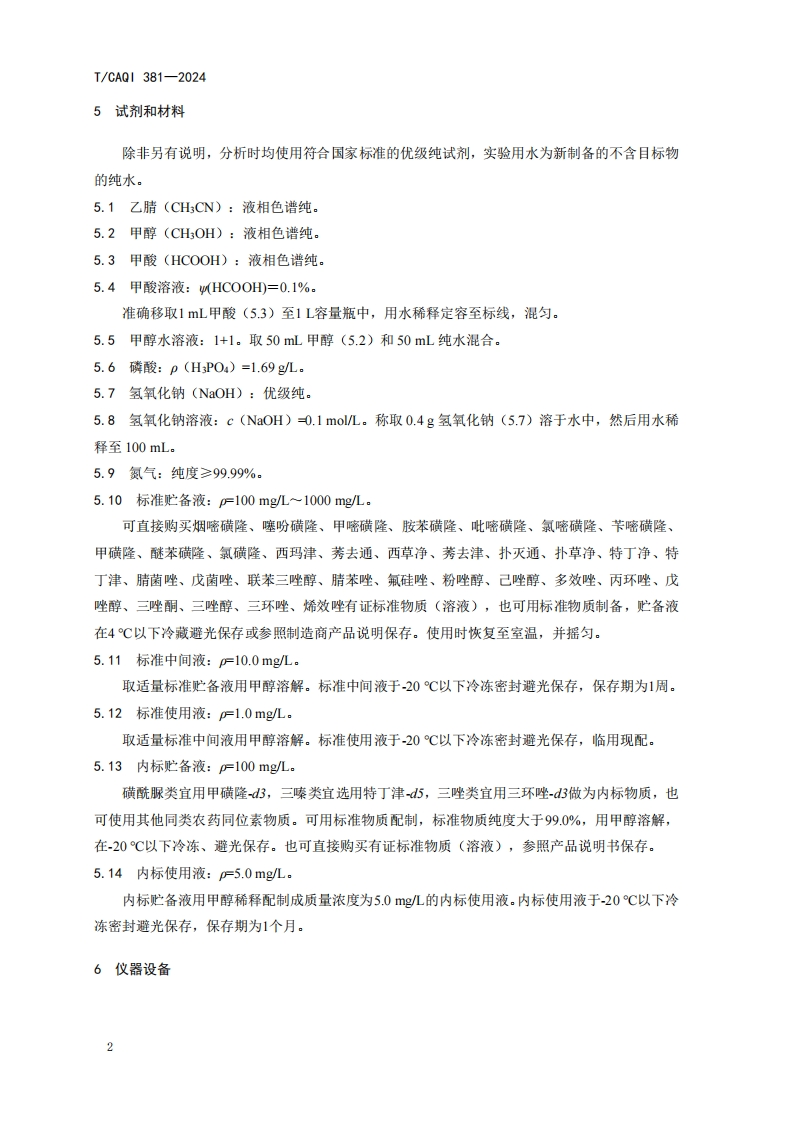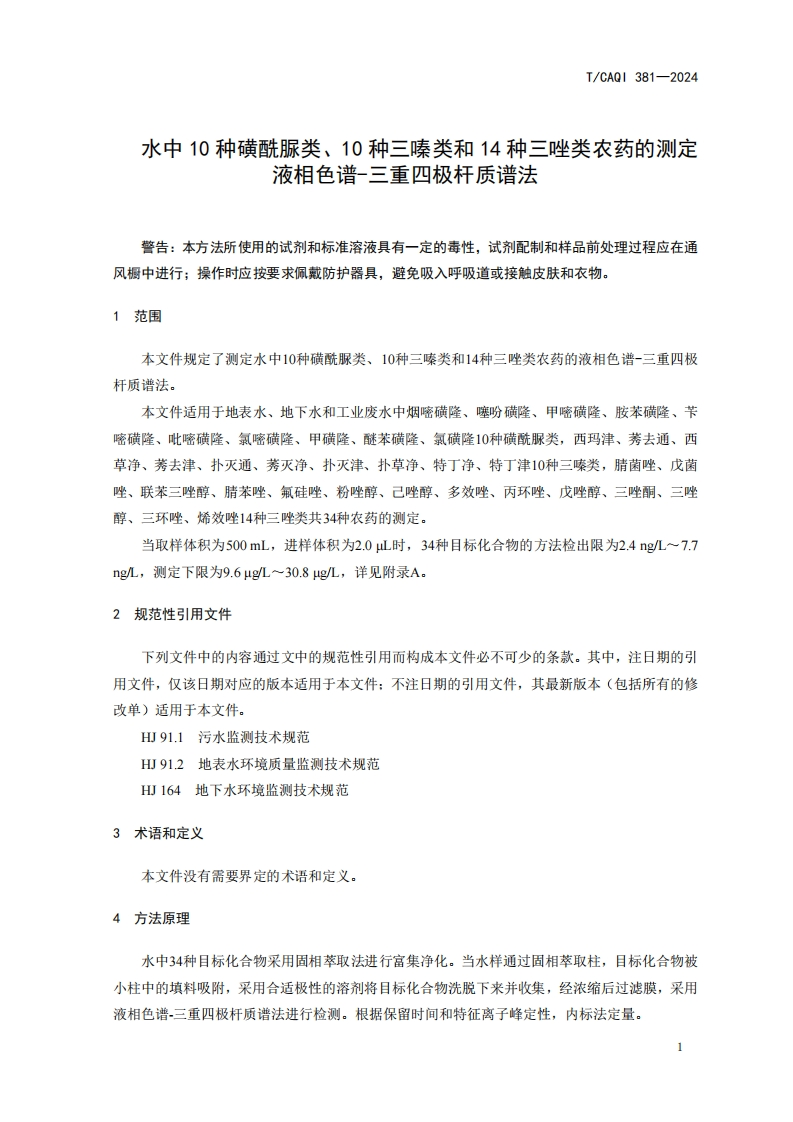 ICS13.060CCS Z16团体标准T/CAQI381-2024水中10种磺酰脲类、10种三嗪类和14种三唑类农药的测定液相色谱-三重四极杆质谱法Determination of 10 sulfonylurea,10 triazine and 14 triazole pesticides in waterLiquid chromatography-Triple quadrupole mass spectrometry2024-03-28发布2024-04-12实施中国质量检验协会发布