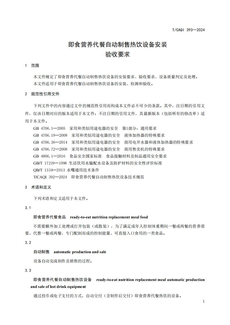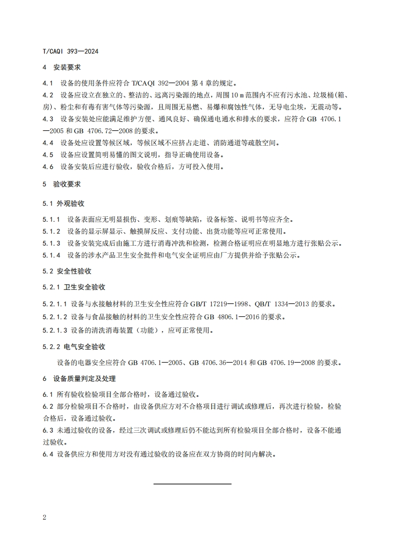 T-CAQI-393-2024《即食营养代餐自动制售热饮设备安装验收要求》348072@abc前天发布关注私信0.20MB5页040T-CAQI-393-2024《即食营养代餐自动制售热饮设备安装验收要求》此内容为付费资源,请付费后查看¥19¥39黄金会员免费钻石会员免费立即购买您当前未登录!建议登陆后购买,可保存购买订单付费资源 第1页 / 共5页 第2页 / 共5页 第3页 / 共5页 第4页 / 共5页 第5页 / 共5页 已完成全部阅读,共5页 THE END标准规范 文本预览 ICS55.230CCS Y 69T团体标准T/CAQI393-2024即食营养代餐自动制售热饮设备安装验收要求Installation and acceptance requirements for ready-to-eat nutrition replacementmeal automatic production and sale of hot drink equipment2024-05-23发布2024-06-01实施中国质量检验协会发布 查看更多 收起部分 喜欢就支持一下吧收藏