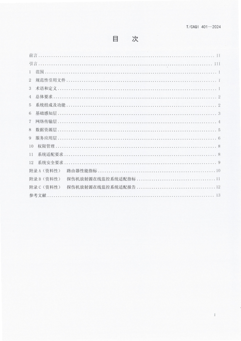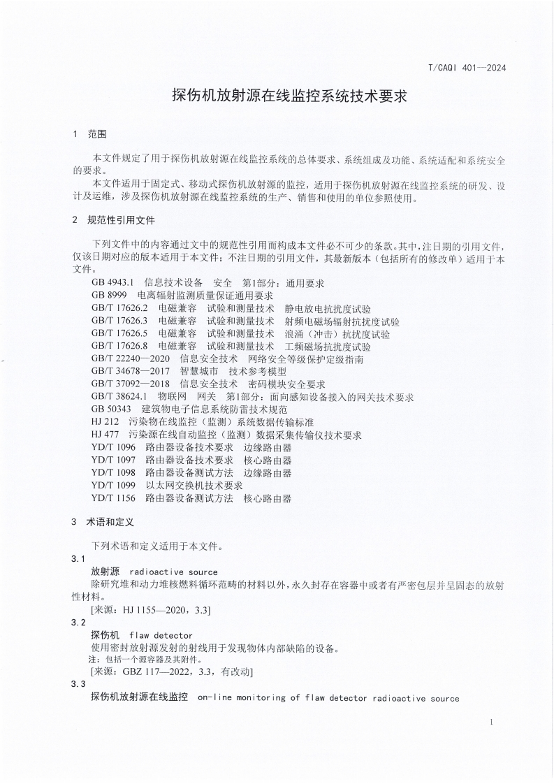 T-CAQI-401-2024《探伤机放射源在线监控系统技术要求》348072@abc前天发布关注私信16.73MB17页036T-CAQI-401-2024《探伤机放射源在线监控系统技术要求》此内容为付费资源,请付费后查看¥19¥39黄金会员免费钻石会员免费立即购买您当前未登录!建议登陆后购买,可保存购买订单付费资源 第1页 / 共17页 第2页 / 共17页 第3页 / 共17页 第4页 / 共17页 第5页 / 共17页 试读已结束,还剩12页,您可下载完整版后进行离线阅读 THE END标准规范 文本预览 1CS13.280CCS Z 10团体标准T/CAQ1401—2024探伤机放射源在线监控系统技术要求Technical requirements for on-line monitor ing system of flaw detectorradioactive source2024-09-23发布2024-09-30实施中国质量检验协会发布 查看更多 收起部分 喜欢就支持一下吧收藏