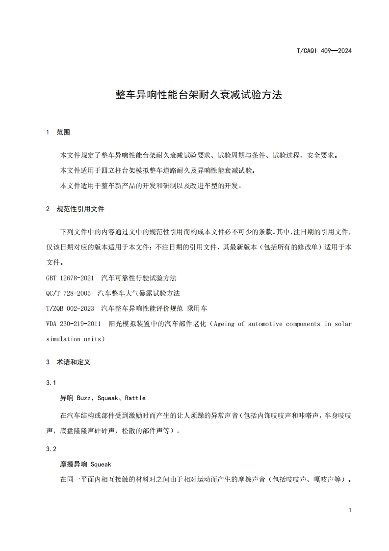 T-CAQI-409-2024《整车异响性能台架耐久衰减试验方法》348072@abc2天前发布关注私信0.40MB18页036T-CAQI-409-2024《整车异响性能台架耐久衰减试验方法》此内容为付费资源,请付费后查看¥19¥39黄金会员免费钻石会员免费立即购买您当前未登录!建议登陆后购买,可保存购买订单付费资源 第1页 / 共18页 第2页 / 共18页 第3页 / 共18页 第4页 / 共18页 第5页 / 共18页 试读已结束,还剩13页,您可下载完整版后进行离线阅读 THE END标准规范 文本预览 ICS43.180CCS R 17团体标准T/CAQI409-2024整车异响性能台架耐久衰减试验方法Complete Vehicle Squeak Rattle Durability Degradation BenchTest Method2024-12-02发布2025-01-01实施中国质量检验协会发布 查看更多 收起部分 喜欢就支持一下吧收藏