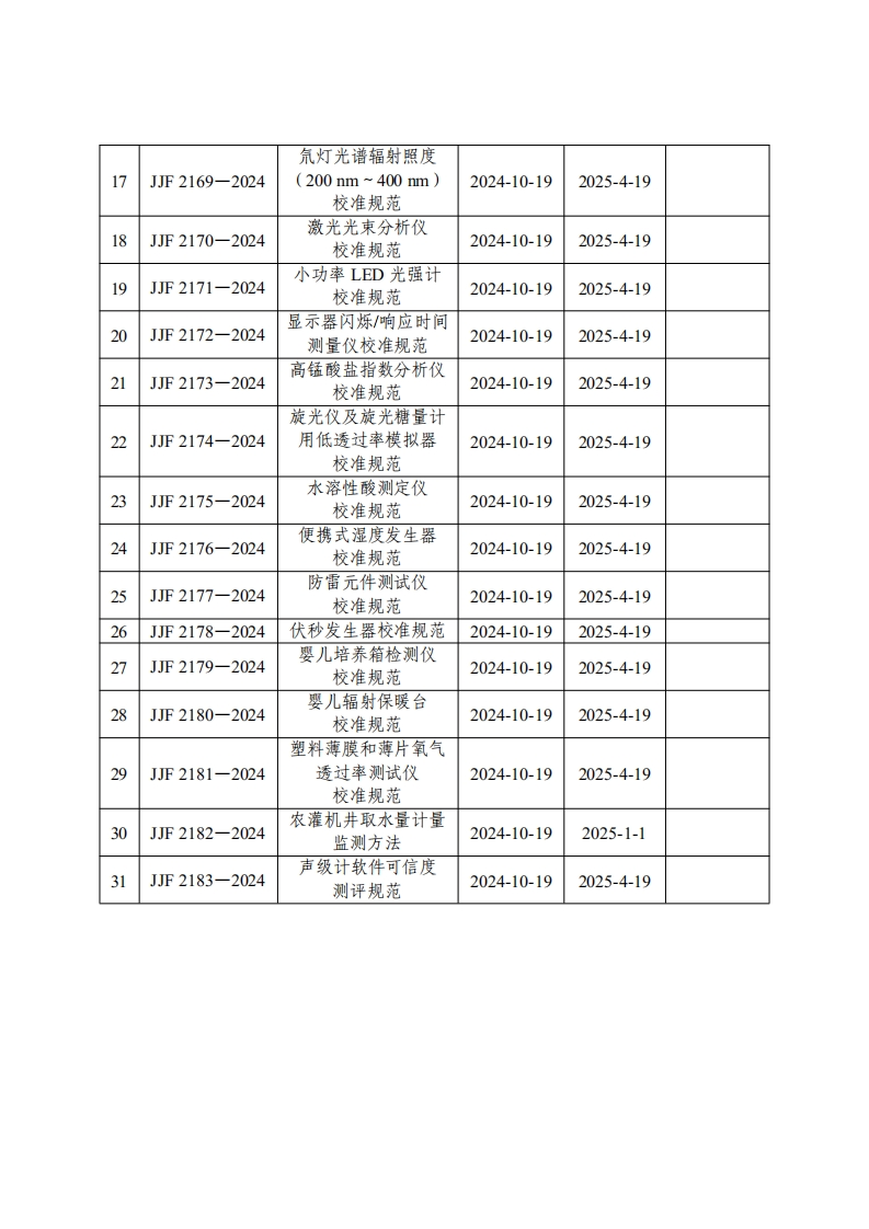 《太赫兹辐射功率计量器具检定系统表》等31项国家计量技术规范名录号编号名称批准日期实施日期备注太赫兹辐射功率JJG2097-2024计量器具检定系统表2024-10-192025-4-19钟罩式气体流量JJG2JJG165-2024标准装置检定规程2024-10-192025-4-19165-2005JJG热量表检定规程225-2001JJG225-20242024-10-192025-4-19附录A以外的内容毫瓦级标准JJGJJG868-2024超声功率源检定规程2024-10-192025-4-19868-1994JJFJJF1544-2024拉曼光谱仪校准规范2024-10-192025-4-191544-2015JJG6JJF2158-2024热量表型式评价大纲2024-10-192025-4-19225-2001附录A7JJF2159-2024零气发生器校准规范2024-10-192025-1-1激光共聚焦显微镜8JJF2160-2024校准规范2024-10-192025-4-19JJG9JJF2161-2024焊接检验尺校准规范2024-10-192025-4-19704-2005缝隙、面差测量仪10JJF2162-2024校准规范2024-10-192025-4-1911JJF2163-2024漆膜划格器校准规范2024-10-192025-4-19在线振动管JJG12JJF2164-2024液体密度计校准规范2024-10-192025-4-19370-2019实验室振动式JJG13JJF2165-2024液体密度仪校准规范2024-10-192025-4-191058-2010电子固体密度天平14JJF2166-2024校准规范2024-10-192025-4-19电阻真空变送器15JJF2167-2024校准规范2024-10-192025-4-1916JJF2168-2024盐雾试验箱校准规范2024-10-192025-4-19