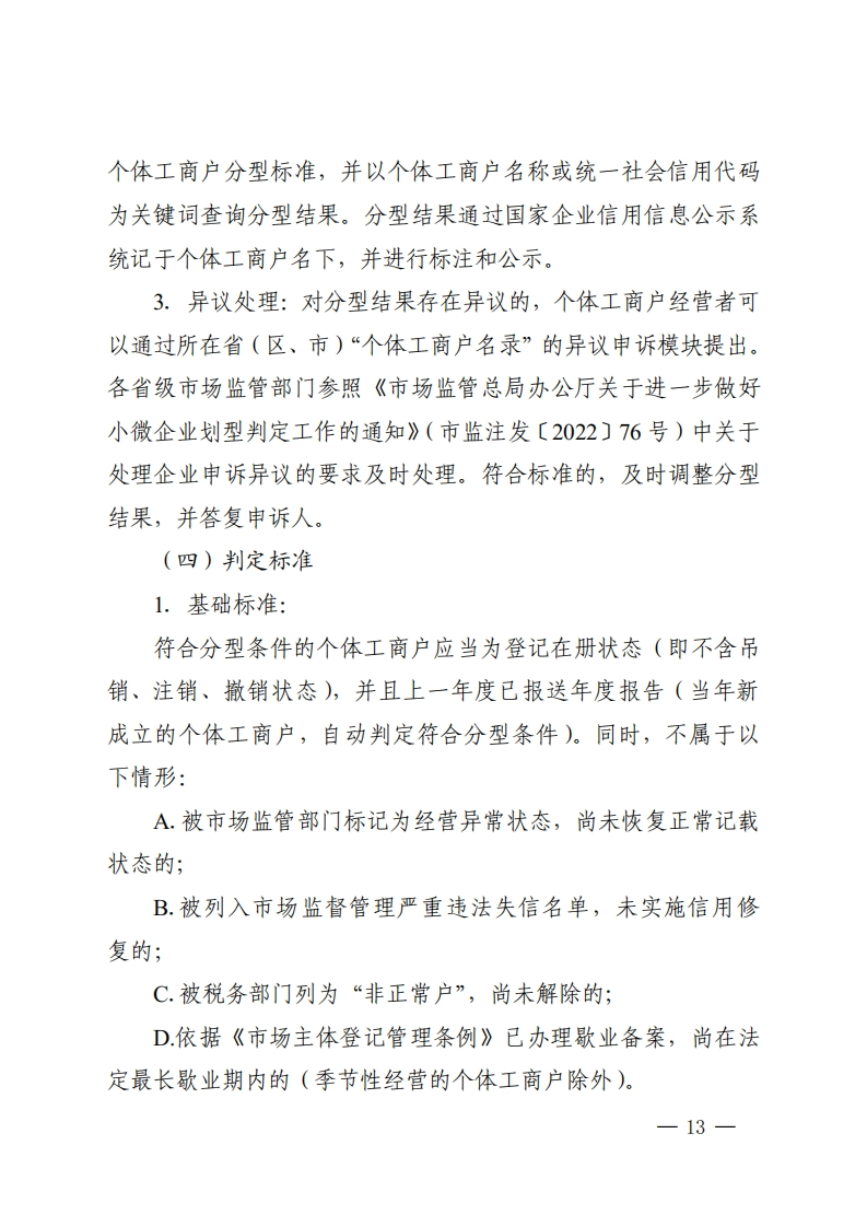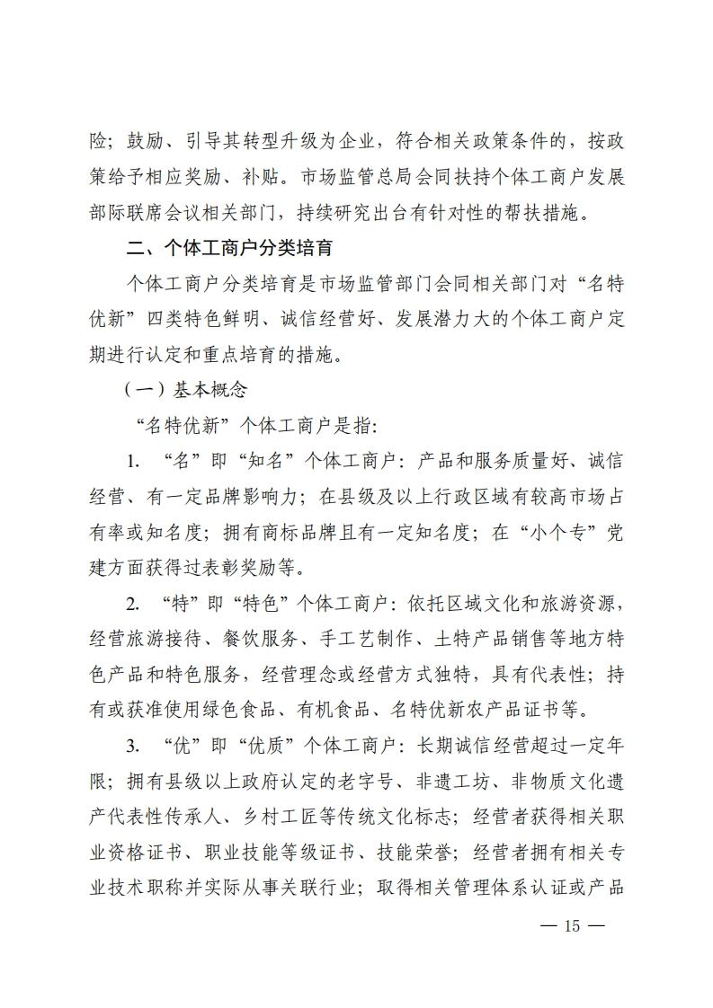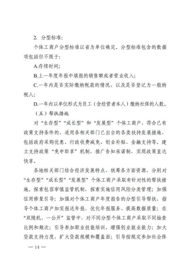 附件个体工商户分型分类精准帮扶总体方案(试行)为贯彻落实《促进个体工商户发展条例》有关规定,指导各地推进个体工商户分型分类精准帮扶工作,提升个体工商户总体发展质量,市场监管总局会同相关部门制定本方案。一、个体工商户分型帮扶个体工商户分型是市场监管部门将实际开展经营活动的个体工商户,按照存续时间、经营状况、纳税情况、雇员人数等指标划分为三种类型,并会同相关部门根据个体工商户不同发展阶段特点实施有效帮扶的措施。(一)基本概念个体工商户分型包括“生存型”“成长型”和“发展型”,具体是指:1.生存型:处于初创阶段,经营规模小、稳定性和抗风险能力差,销售额或者营业收入相对较低的个体工商户。2.成长型:处于稳定持续经营阶段,有少量雇员或者实际缴纳过税款,有一定销售额或者营业收入的个体工商户。3.发展型:处于发展壮大阶段,经营规模较大,有一定税收贡献度或者吸纳就业能力较强,销售额或者营业收入较高,拥有—11