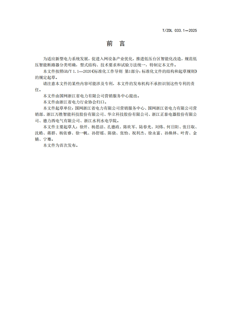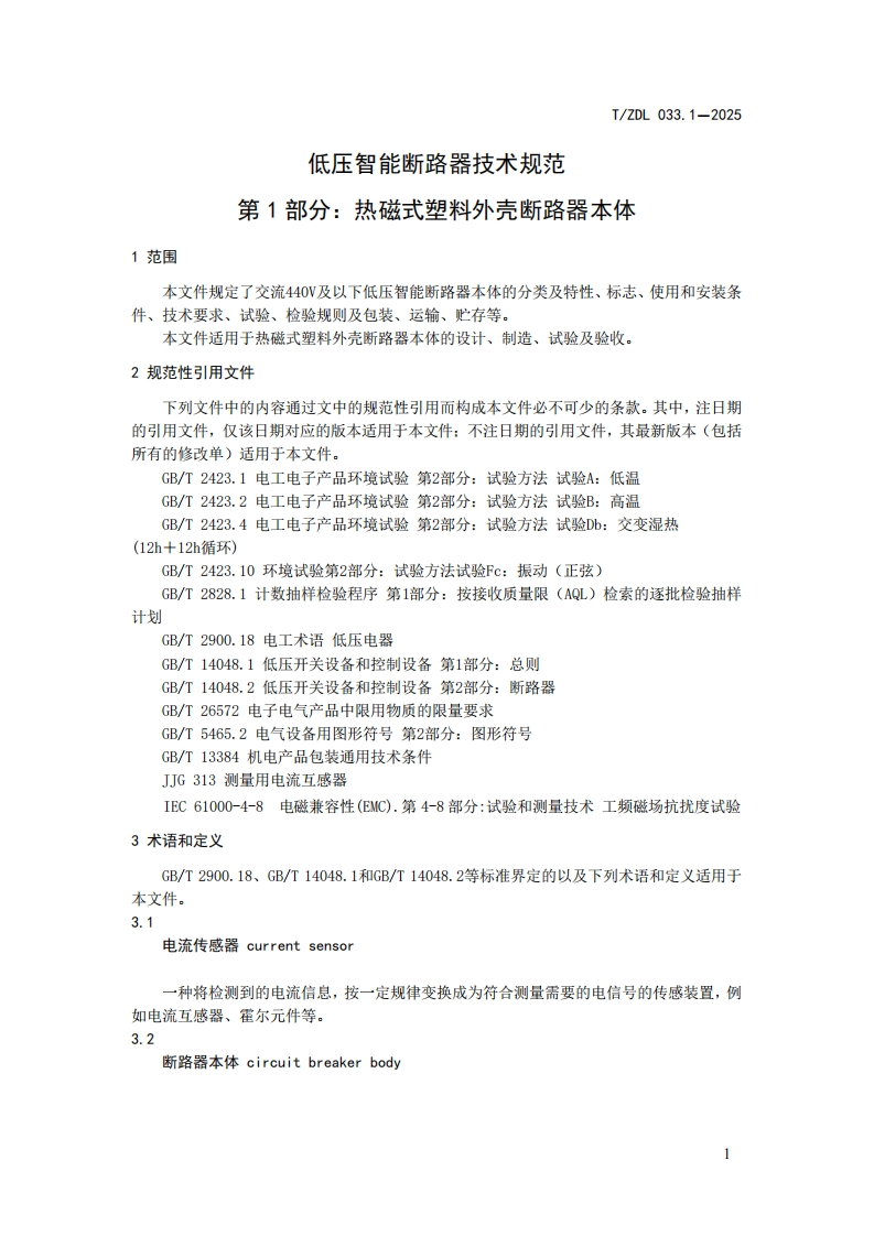 10s29.130.20c0sD4420T/ZDL浙江省电力行业协会团体标准T/ZDL033.1—2025低压智能断路器技术规范第1部分:热磁式塑料外壳断路器本体Technical specification for low voltage intel ligent circuit breakersPart 1:Thermomagnetic plastic case circuit breaker body2025-03-14发布2025-04-01实施浙江省电力行业协会发布