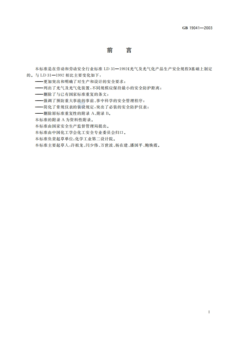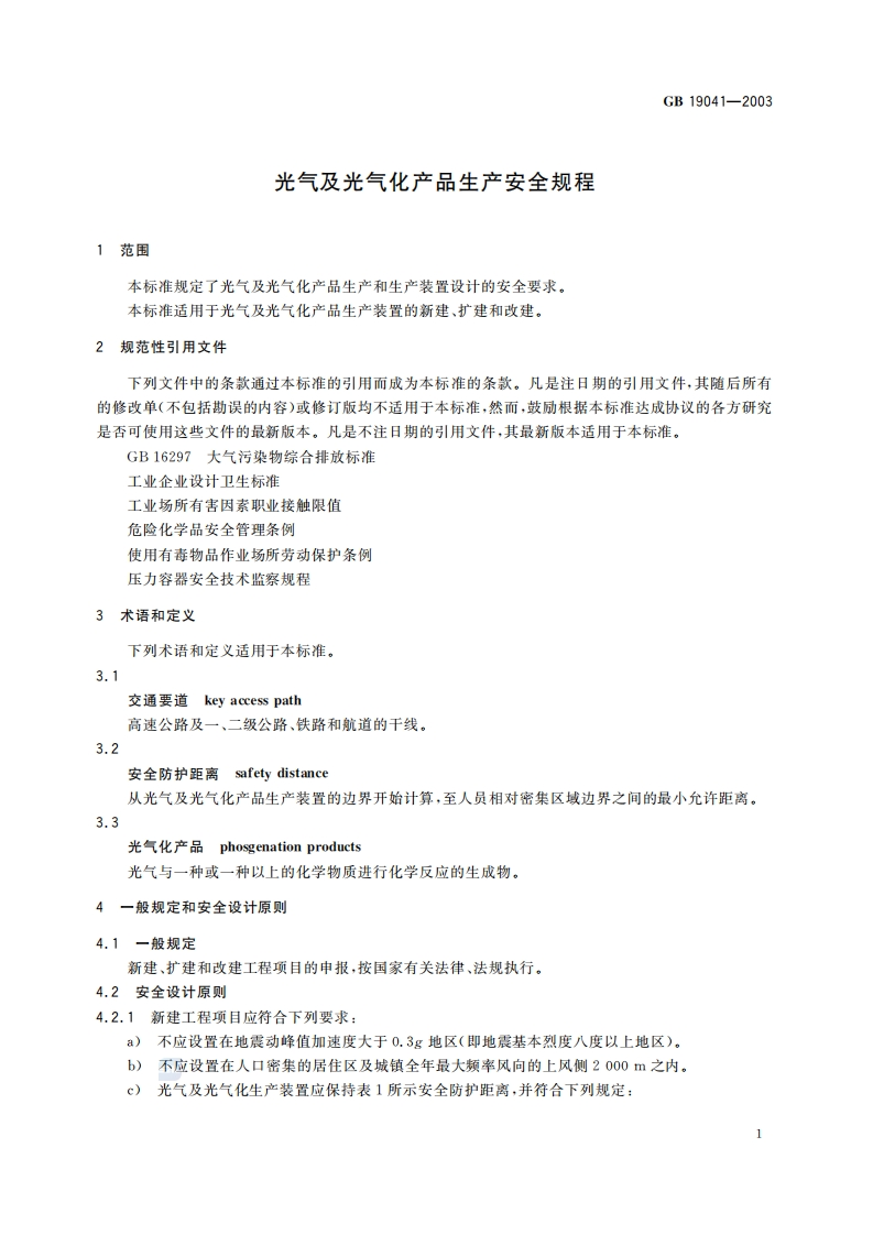 ICS71.020G09中华人民共和国国家标准GB19041-2003光气及光气化产品生产安全规程Safety regulations for the production of phosgene and phosgenation products国家标准全文公开系统专用,此文本仅供个人学习、研究之用,未经授权,禁止复制、发行、汇编、翻译或网络传播等,侵权必究全国标准信息公共服务平台:http3:/std.sam.go.cm2003-03-13发布2003-10-01实施中华人民共和国国家质量监督检验检疫总局发布