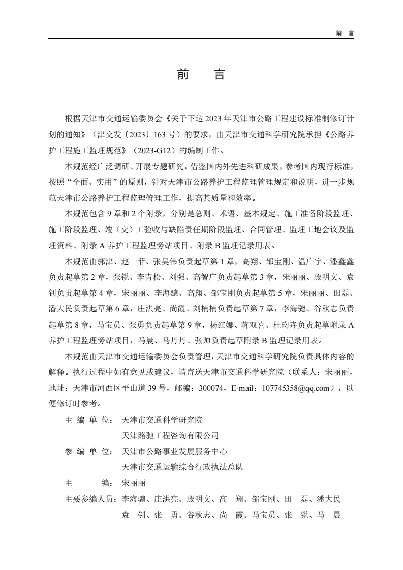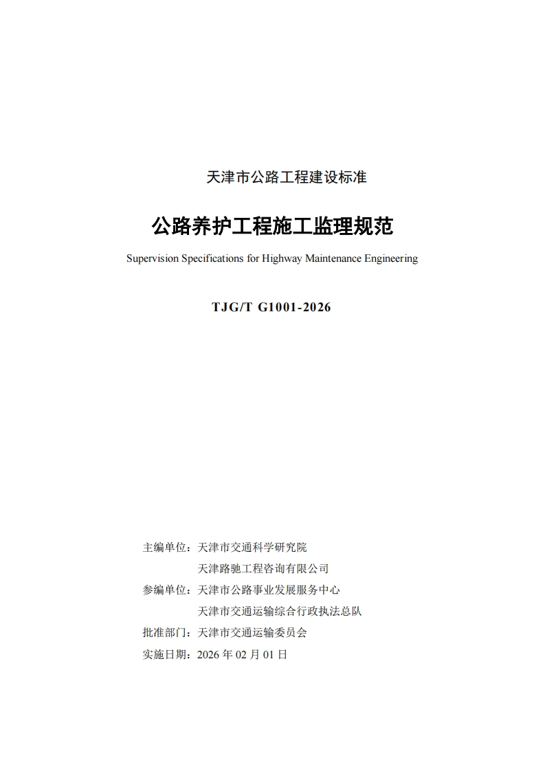 公路养护工程施工监理规范-Supervision-Specifications-for-Highway-Maintenance-Engineering348072@abc5天前发布关注私信0.42MB42页034公路养护工程施工监理规范-Supervision-Specifications-for-Highway-Maintenance-Engineering此内容为付费资源,请付费后查看¥19¥39黄金会员免费钻石会员免费立即购买您当前未登录!建议登陆后购买,可保存购买订单付费资源 第1页 / 共42页 第2页 / 共42页 第3页 / 共42页 第4页 / 共42页 第5页 / 共42页 试读已结束,还剩37页,您可下载完整版后进行离线阅读 THE END标准规范 文本预览 TJG天津市公路工程建设地方标准TJG/TG1001-2026公路养护工程施工监理规范Supervision Specifications for Highway Maintenance Engineering2026-01-01发布2026-02-01实施天津市交通运输委员会发布 查看更多 收起部分 喜欢就支持一下吧收藏