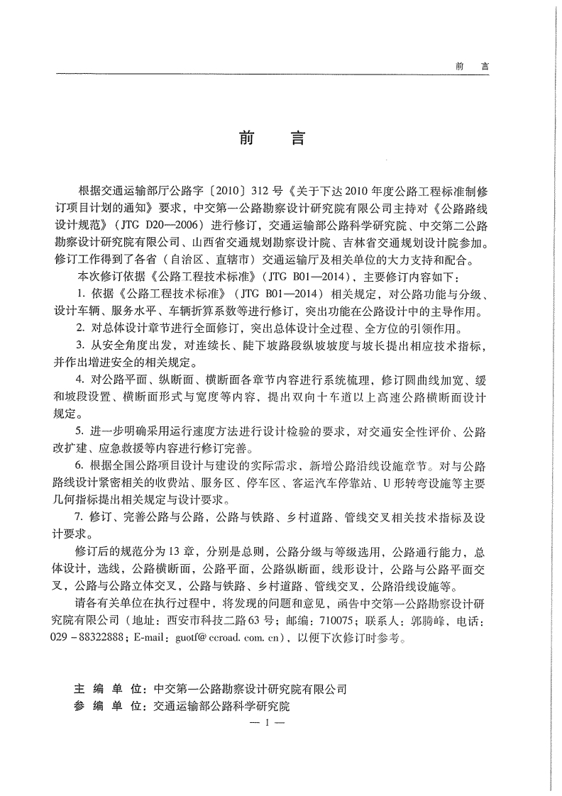 公路路线设计规范-Design-Specification-for-Hichway-Alignment-JTG-D20-2017-主编单位_中交第一公路勘察设计研究院有限公司-批准部门_中华人民共和国交通运输部-实施日期_2018年01月01日348072@abc6天前发布关注私信13.27MB204页021公路路线设计规范-Design-Specification-for-Hichway-Alignment-JTG-D20-2017-主编单位_中交第一公路勘察设计研究院有限公司-批准部门_中华人民共和国交通运输部-实施日期_2018年01月01日此内容为付费资源,请付费后查看¥19¥39黄金会员免费钻石会员免费立即购买您当前未登录!建议登陆后购买,可保存购买订单付费资源 第1页 / 共204页 第2页 / 共204页 第3页 / 共204页 第4页 / 共204页 第5页 / 共204页 试读已结束,还剩199页,您可下载完整版后进行离线阅读 THE END标准规范 文本预览 中华人民共和国行业标准公路路线设计规范Design Specification for Highway AlignmentJTGD20-2017主编单位:中交第一公路勘察设计研究院有限公司批准部门:中华人民共和国交通运输部实施日期:2018年01月01日人武安通出版丝股份有限公司 查看更多 收起部分 喜欢就支持一下吧收藏