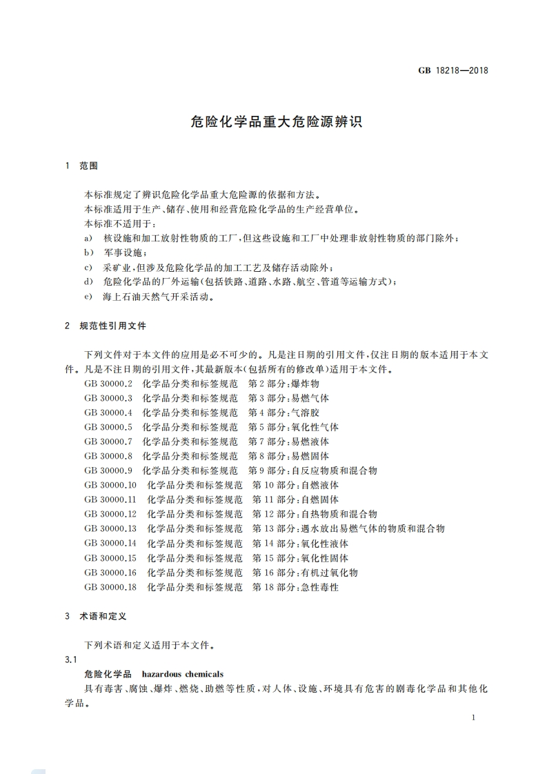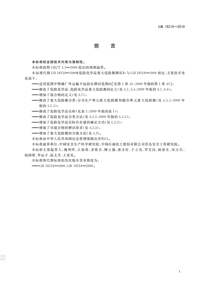 ICS13.300A80中华人民共和国国家标准GB18218-2018代替GB18218一2009危险化学品重大危险源辨识Identification of major hazard installations for hazardous chemicals国家标准全文公开系统专用,此文本仅供个人学习、研究之用,未经授权,禁止复制、发行、汇编、翻译或网铬传播等,侵权必究全国标准信息公共服务平台:http3:/std.sam.gow.cm2018-11-19发布2019-03-01实施国家市场监督管理总局中国国家标准化管理委员会发布