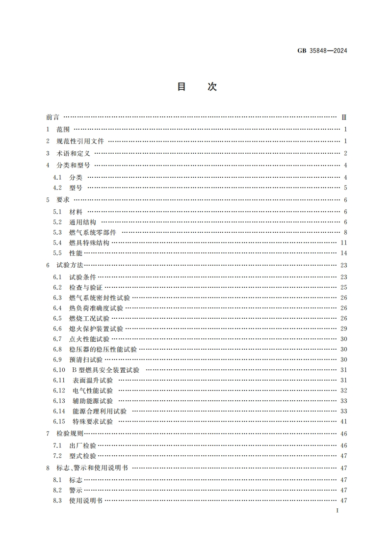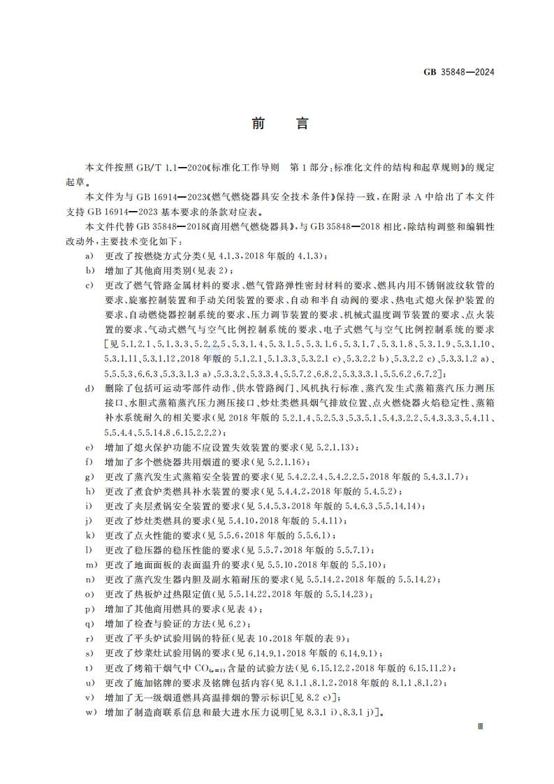ICS91.140CCS P 45GB中华人民共和国国家标准GB35848-2024代替GB35848一2018商用燃气燃烧器具Commercial gas-burning appliance园国家标准全文公开系统专用,此文本仅供个人学习、研究之用,未经授权,禁止复制、发行、汇编、翻译或网铬传播等,侵权必究全国标准信息公共服务平台:https:/std.sam.ow.cm2024-04-29发布2024-08-01实施国家市场监督管理兽局发布国家标准化管理委员会