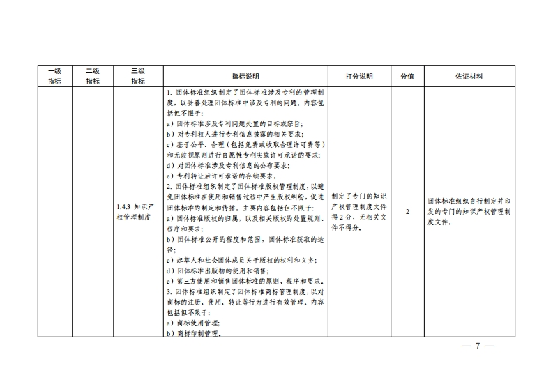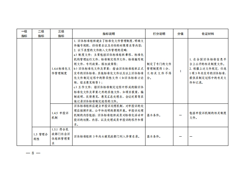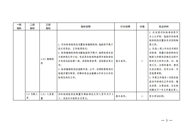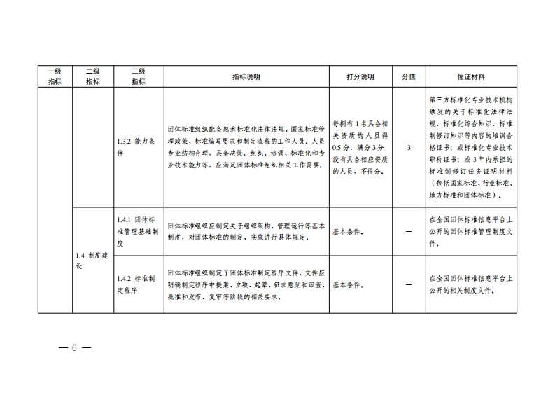 团体标准组织综合绩效评价指标体系一级二级三级指标指标说明打分说明分值佐证材料指标指标团体标准组织应制定专门的标准化发展规划,持续有1.1战略规111标准化效支挥组织自身标准化工作高质量发展。规划的内容划发展规划应包括:战略目标,愿景,中长期工作规划,重点工基本条件。按照团体标准组织议事规则制定的标准化发展规划,作、资源配置,预期成果等。1,团体标准组织应设置标准化工作决策机构,包括但不限于理事会,董事会、全体大会等形式:在全国团体标准信惠平台上1.2.1决策机2.决策机构的功能包括但不限于:制定团体标准化的润发展规划,对与团体标准化活动相关的政策,制度和基本条件。公开的,包括团体标准组织标准化文件的发布等进行决策:机构设置相关内容的制度文3.决策机构应按照开放、公平,透明的原则进行组建件。并履行职责。1组织管L,团体标准组织应设置标准化工作管理协调机构,包理能力括但不限于标准管理委员会、秘书处,专家咨询委员12组织机构会等形式:2.管理协调机构的功能包括但不限于:制定团体标准在全国团体标准信息平台上化工作的各项政策和制度,管理和协调团体标准化工1.22协调机作,处理有关团体标准的制修订,知试产权管理,争基本条件。公开的,包括团体标准组织构机构设置相关内容的制度文议处置等,开展与其他标准化机构的联络,根据团体不同领城建立具有广泛代表性的标准化技术组织,确件,定标准化技术组织的工作范国等:3.管理协调机构应按照开放、公平,透明的原则进行组建并履行职责,一4