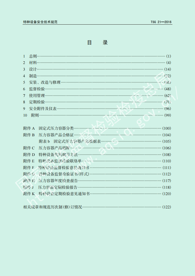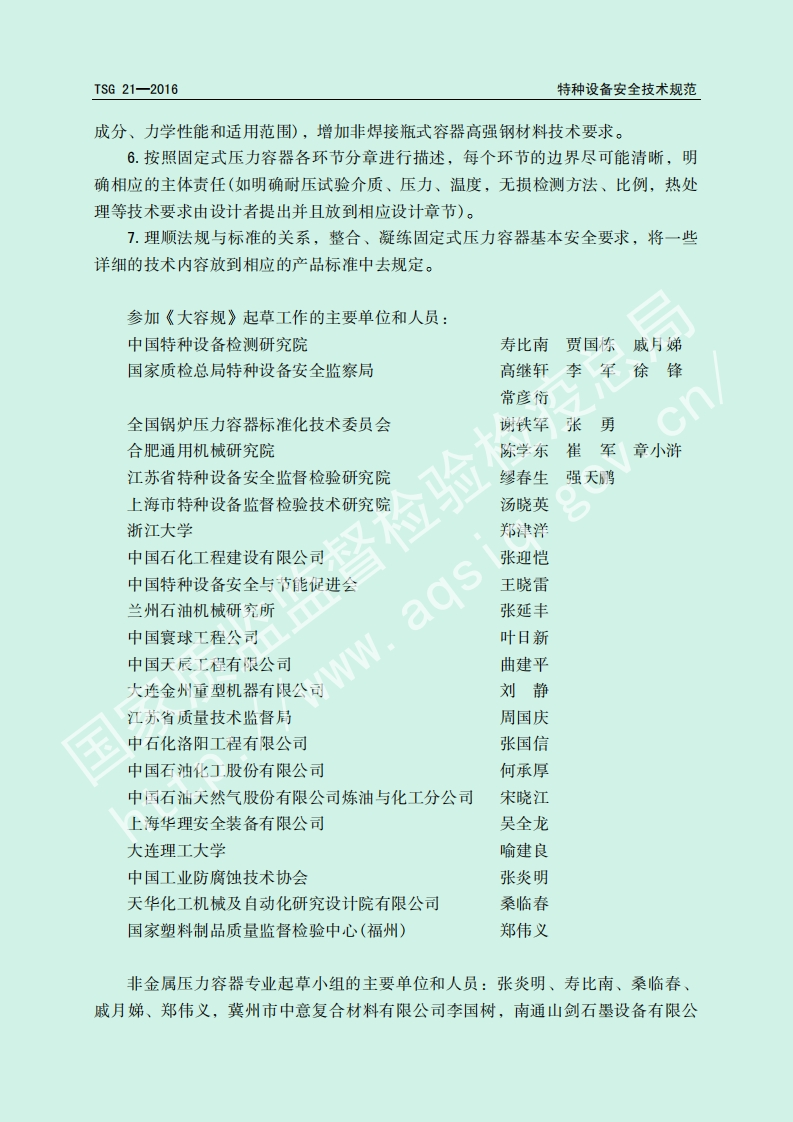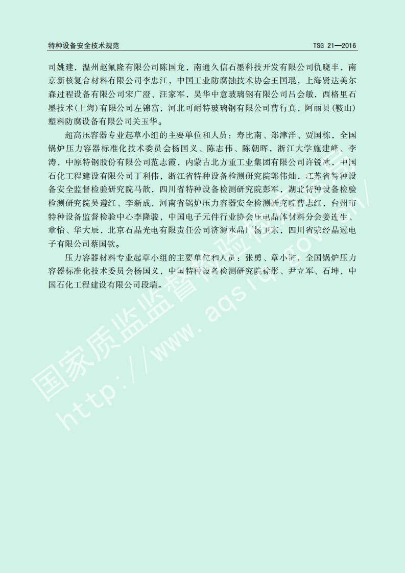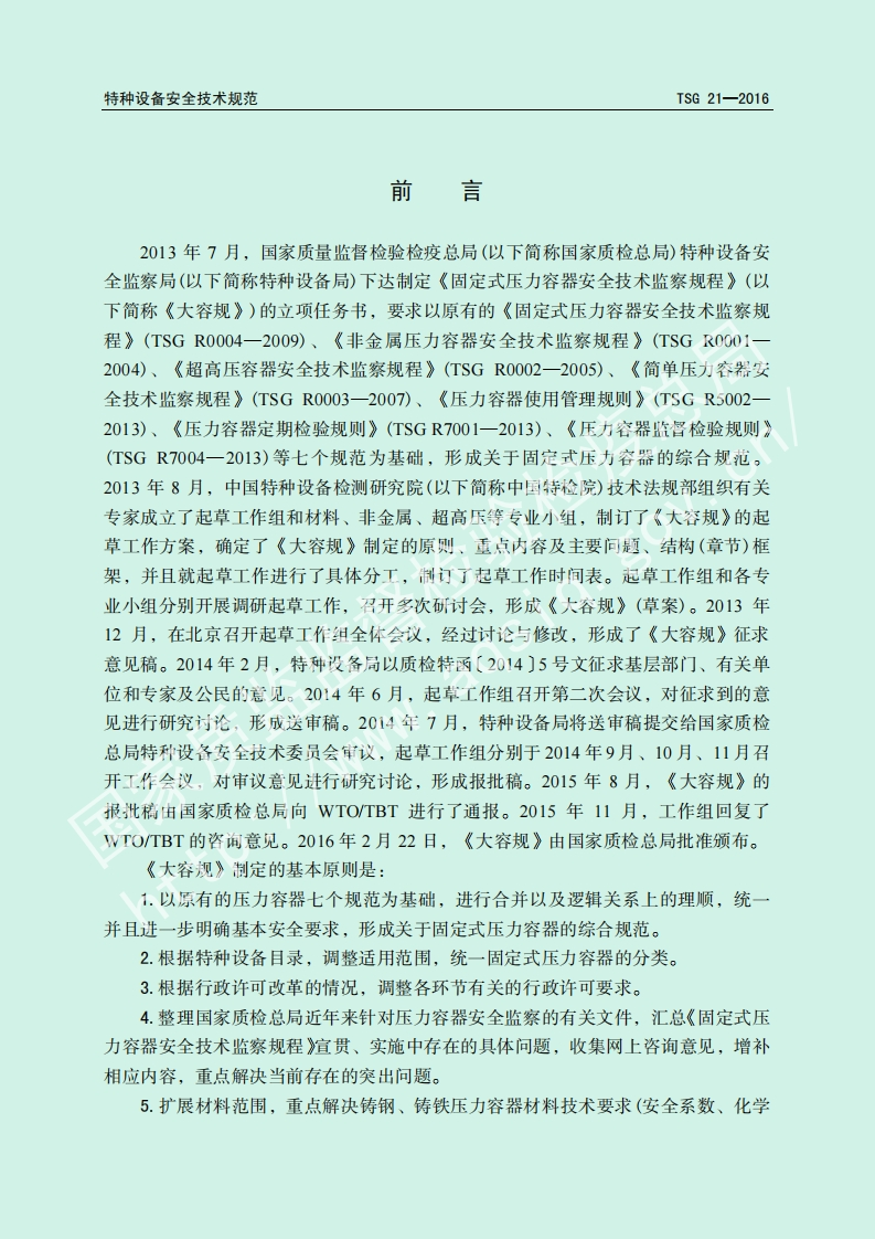 固定式压力容器安全技术-监察规程-Supervision-Regulation-on-Safety-Technology-for-Stationary-Pressure-Vessel348072@abc8天前发布关注私信1.23MB171页037固定式压力容器安全技术-监察规程-Supervision-Regulation-on-Safety-Technology-for-Stationary-Pressure-Vessel此内容为付费资源,请付费后查看¥19¥39黄金会员免费钻石会员免费立即购买您当前未登录!建议登陆后购买,可保存购买订单付费资源 第1页 / 共171页 第2页 / 共171页 第3页 / 共171页 第4页 / 共171页 第5页 / 共171页 试读已结束,还剩166页,您可下载完整版后进行离线阅读 THE END标准规范 文本预览 TSG特种设备安全技术规范TSG21-2016固定式压力容器安全技术监察规程Supervision Regulation on Safety Technology forStationary Pressure Vessel中华人民共和国国家质量监督检验检疫总局颁布2016年2月22日 查看更多 收起部分 喜欢就支持一下吧收藏